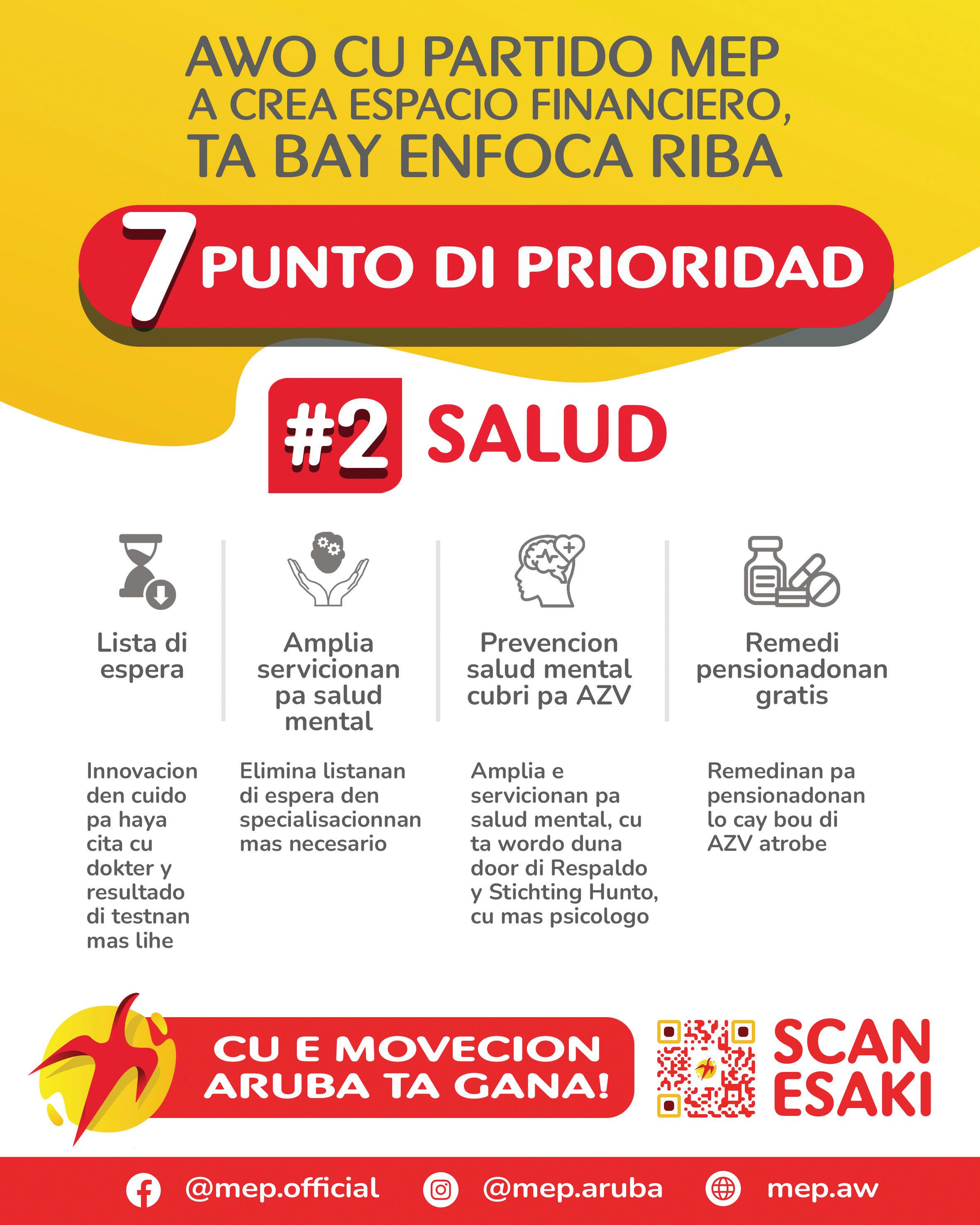 Durante e ultimo 7 añanan di gobernacion, Partido MEP a traha riba stabilisa pais Aruba y awor cu a crea espacio financiero, Partido MEP ta bay enfoca riba 7 punto di prioridad.