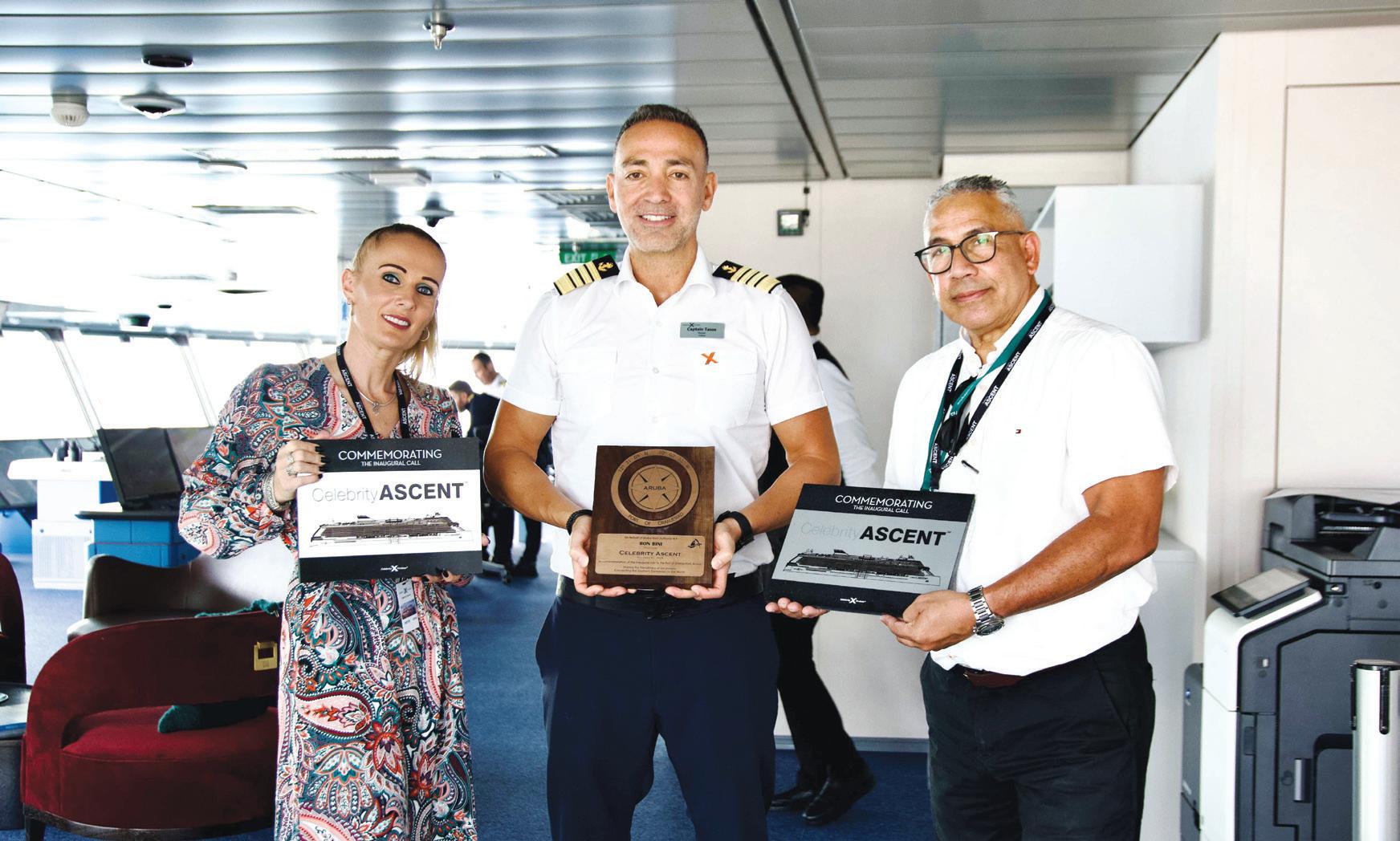 Presente tabata Monica Bos - Cruise Manager di Aruba Tourism Authority, hunto cu Irvin GilNautical Manager di Aruba Ports Authority, y representantenan di Port Agency Maduro & Sons, oficialmente a obsekia Capitan Anastasios Kafetzis y su tripulacion un plakaat como tradicion maritimo. E intercambio aki entre e oficialnan local y capitan di e barco crucero ta crea un lazo fuerte y aprecio mutuo entre Aruba y Celebrity Cruises.