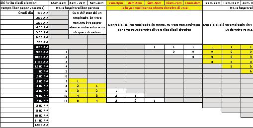 un siman adelanta, ki nan orario di trabou lo ta, y alaves nan oranan liber, pa por bai eherce nan derecho pa vota riba dia di eleccion. Tabla di tempo liber
