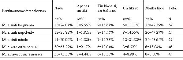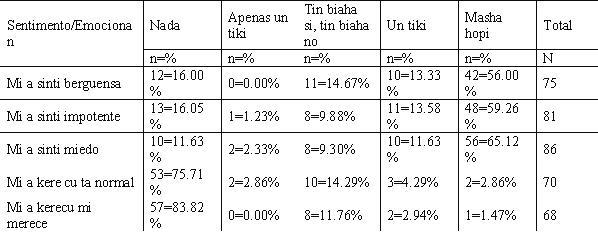 E Tabel aki ta mustra cu e emocion ¨mi a sinti miedo¨ a ser menciona como sentimento mas negativo {78.18%} sigui pa ¨mi a sinti impotente {76.36%} y despues sigui pa: ¨mi a sinti berguensa loke ta [70.37%]. Un biaha mas e sentimentonan ¨mi tabata kere cu e ta normal¨ y ¨mi ta kere cu mi merece¨ a ser rechaza casi totalmente pa e respondientenan respectivamente pa [65.22%] y [73.33%]. Tog un di cada 3 hende muhe y un di cada 4 ta kere cu