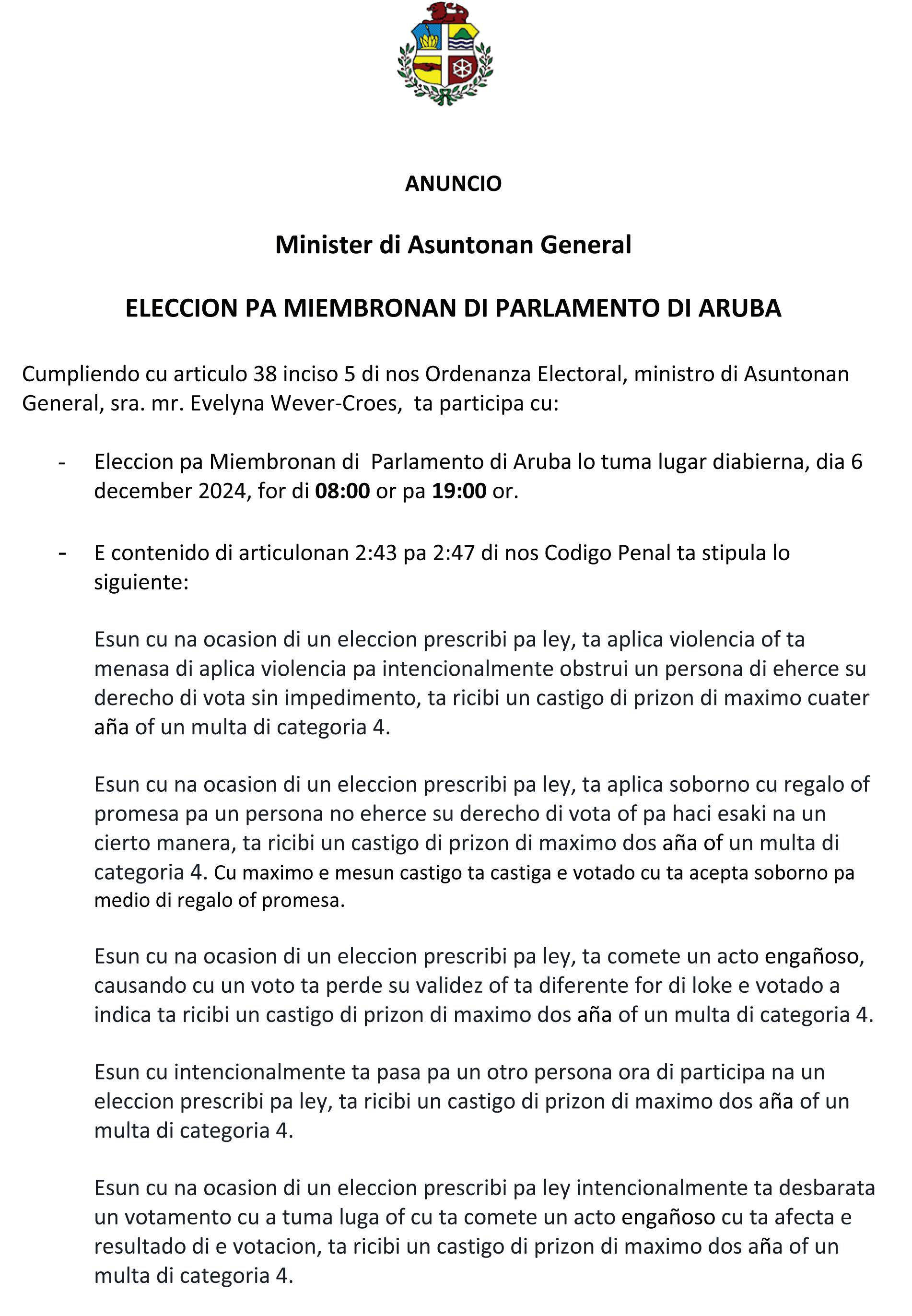 ● Puntonan di Atencion: Recordatorio pa mantene ordo, maneho di situacionnan di emergencia, y cumplimento di regulacionnan electoral.