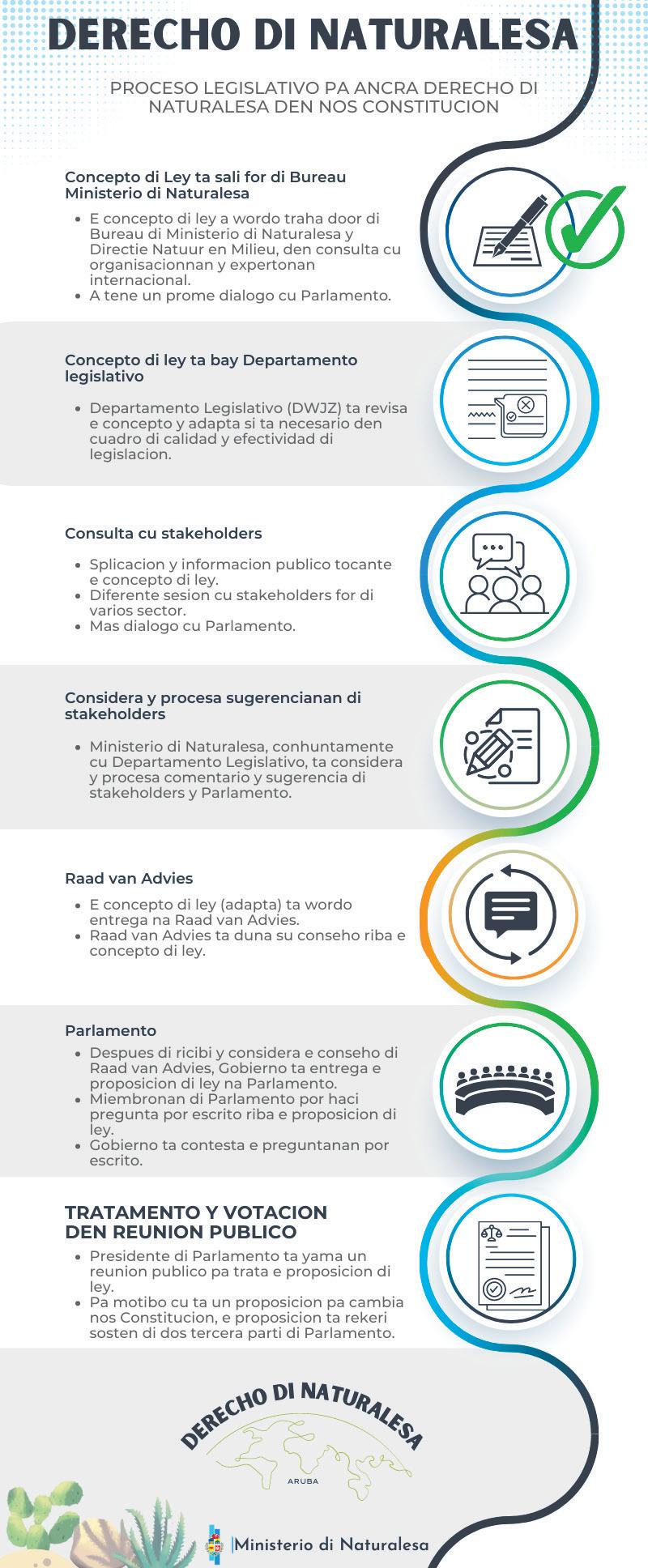 Despues ta entrega e proposicion di ley y conseho di RvA na Parlamento mientras Parlamento por haci pregunta por escrito y ricibi contesta di Minister den preparacion pa e reunion publico. Den Parlamento lo culmina e proceso legislativo pa ancra Derecho di Naturalesa den constitucion. Mirando cu ta trata di cambio den Constitucion, e proposicion ta rekeri sosten di dos tercera parti di Parlamento.