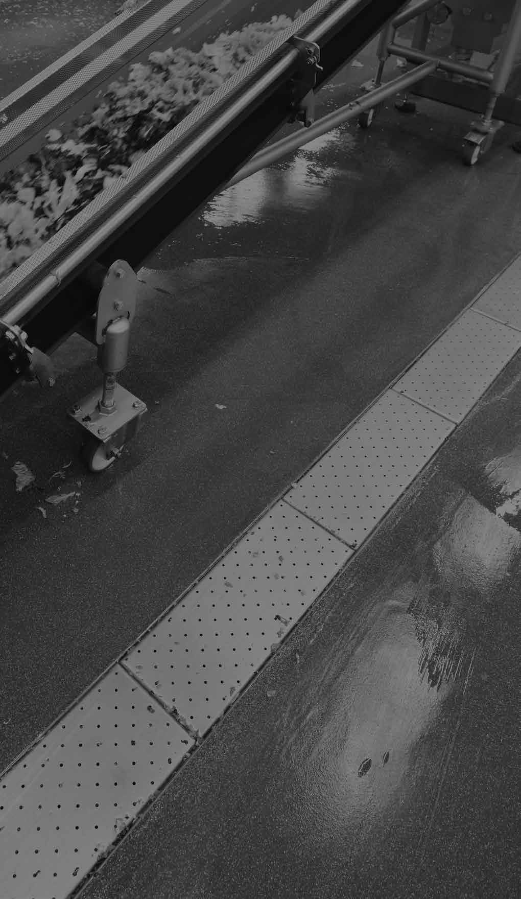 floor. Machinery and heavy traffic from means of transport will cause cracks and fissures. Dirt, dust and micro-organisms accumulate, with major risks to food safety. The same applies to a floor that is not completely seamless, pore-tight and therefore impenetrable. Here, bacteria and fungi can multiply in joints or seams. The transition from floors to walls and drains, for example, should be seamless for the same reason. Also, if a floor is difficult to clean or not resistant to chemical cleaners, bacteria and fungi can have free rein. Finally, repairing an incorrect or got damaged floor means stopping production. Unwanted production losses and high costs are the result.