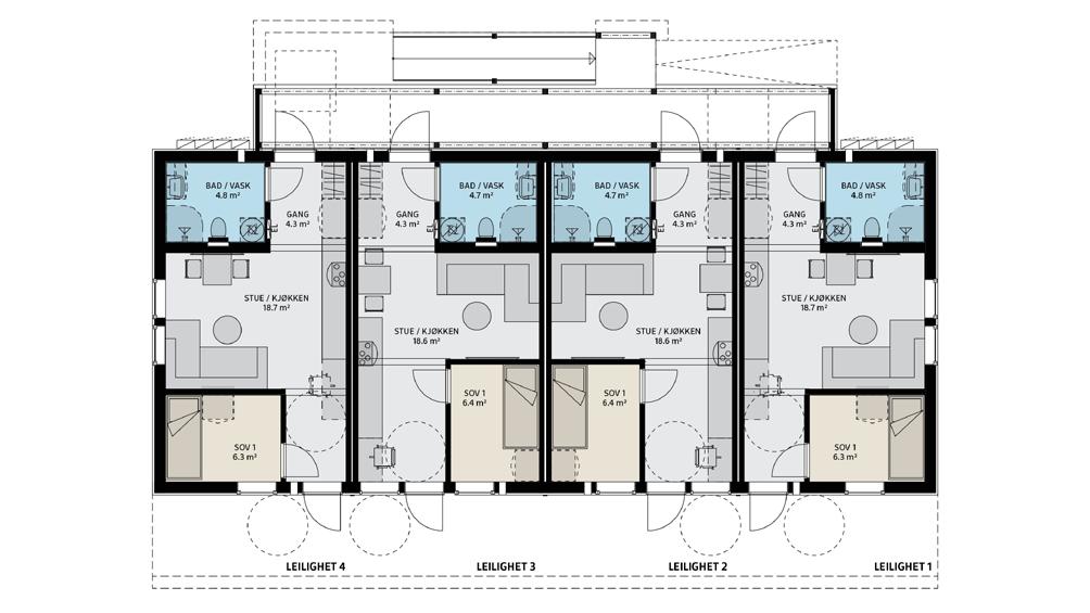 Firemannsboligen består av fire boenheter med boareal på 70 kvm, og inneholder to soverom, romslig bad, bod og en åpen stue- og kjøkkenløsning. Leilighetene har en hyggelig sosial sone med åpen kjøkken- og stueløsning på nær 30 kvm. Herfra er det utgang til markterrasse i første etasje og balkong i andre etasje.
