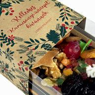 Száríto szürkemarha hús díszdobozban, Tormás krémméz, Zserbó bonbon, Szálas gyümölcstea, valódi gyümölcsből