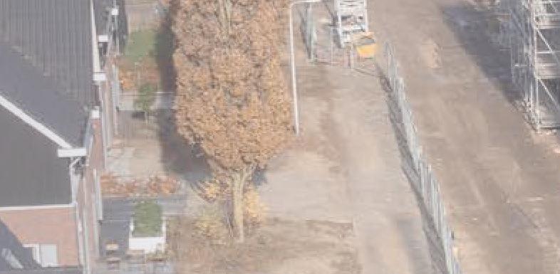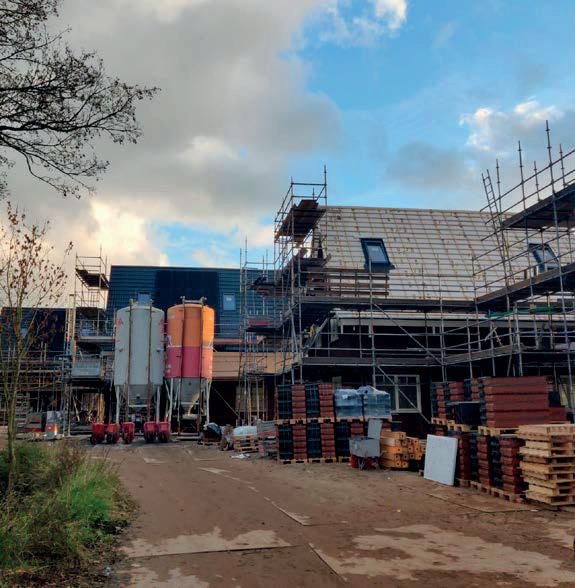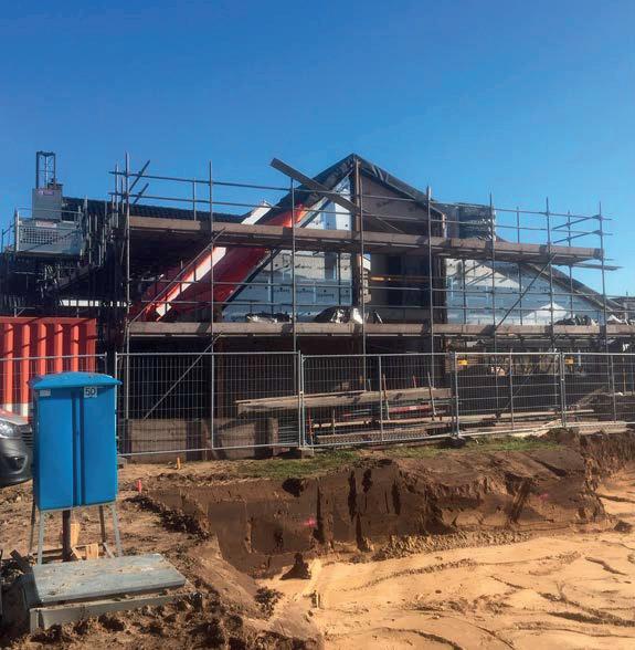 In mei van dit jaar zijn de eerste palen voor de woningen geslagen.Ten tijde van dit schrijven worden de daken voorzien van dakpannen en pv-panelen en is de afbouw van de woningen in volle gang. De volgende stap is het laten zakken van de steigers.