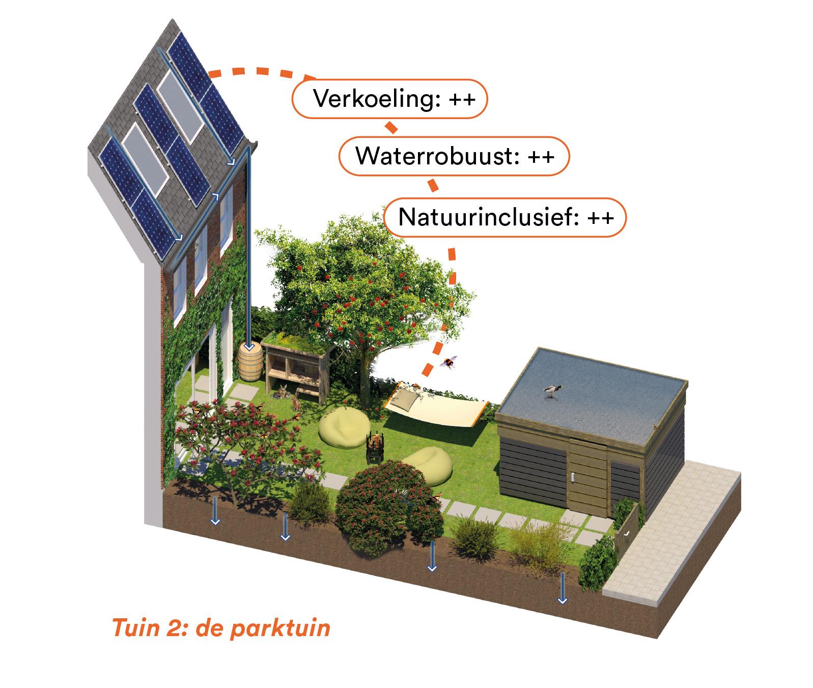 Deze inspiratietuin biedt veel ruimte voor een potje voetbal met de kids, of fijn loungen op een zondag. De groene gevel zorgt voor een koeler huis en is een fijne plek voor insecten en kleine vogels. De kleine fruitboom zorgt voor schaduw en voedsel voor vogels en kleine zoogdieren. Het kruidenrijke gazon laat goed water door. De bestrating bestaat uit het minimale: stapstenen. Water wordt opgevangen door middel van een waterton en waterschutting in de berging. In plaats van een schutting is gekozen voor een dichte haag, hierdoor kunnen egels ook de tuin betreden. De beplantingsstrook bestaat uit een mix van kleine bomen, struiken en lagere planten.