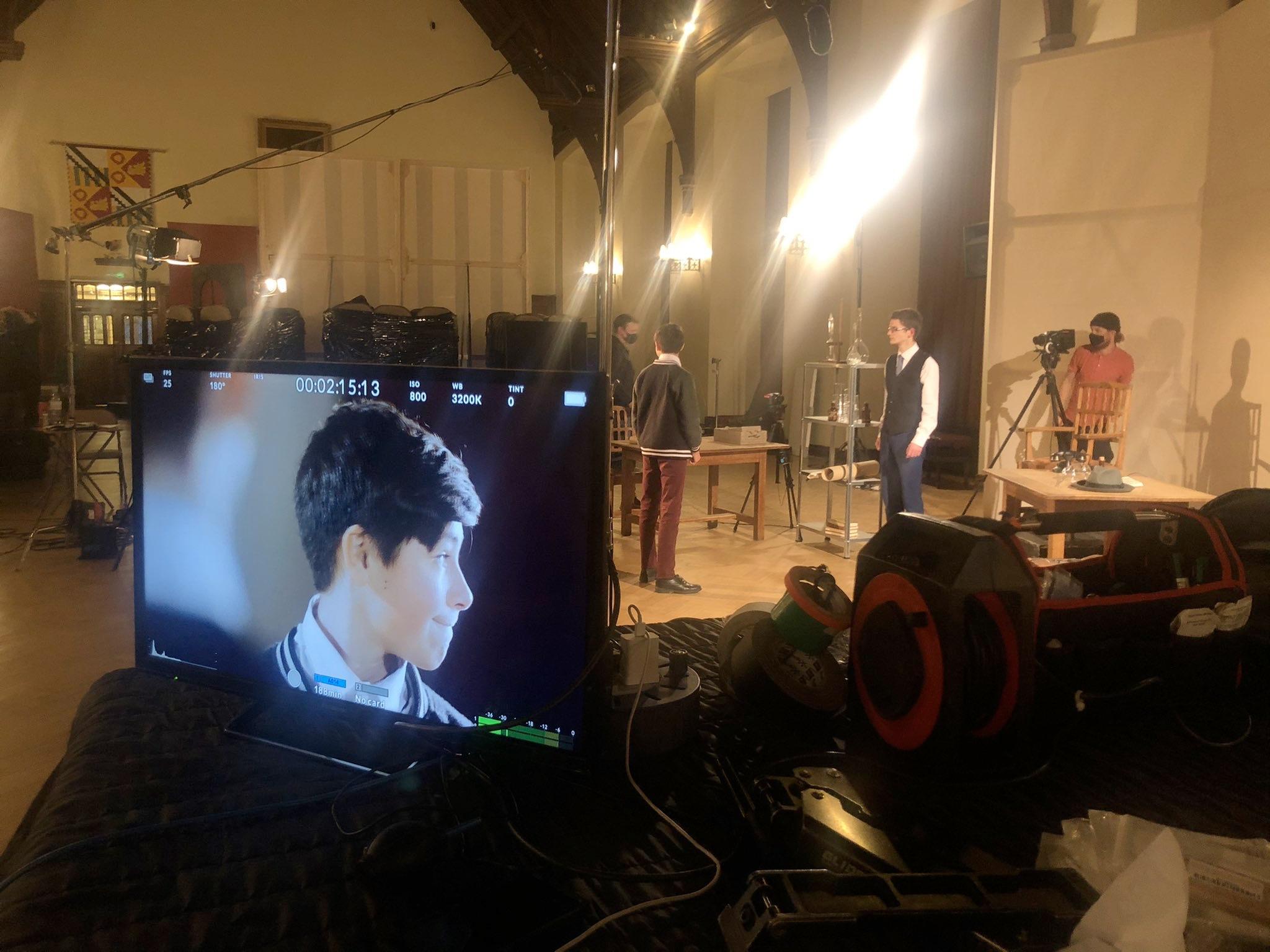 The Great Hall at the School was a socially distanced film set for three days. A couple of the cast had to isolate at home during the filming days, but through the wonder of technology were still able to feature in the film as celestial voices. Some elements of the production were perhaps more muted than they would usually be due to COVID-safe approaches and the piece was distanced according to year group bubbles. The characters playing George, young George/ Tommy and Mary were part of the same household bubble.