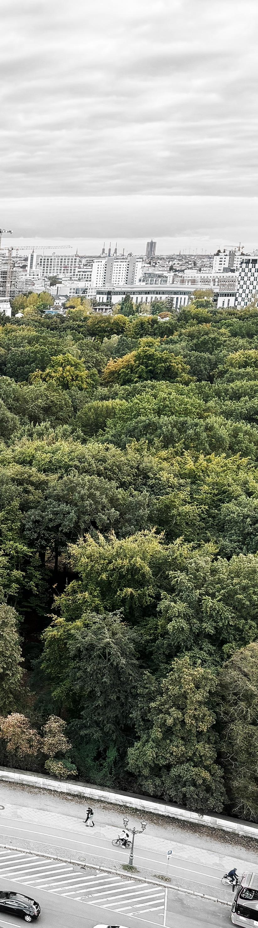 In the book Tiergarten, landscape of transgression: (this obscure object of desire), by Sandra Bartoli and Jörg Stollmann, discribes the relation between Interbau residence and the natural environment of Tiergarten in 1950s: ...housing blocks rise like rocks from a sea of vegetation, and apart from the highway roads... covered by plants... stating that... the city would become in this way a landscape, not only metaphorically but also factually. Reflecting the vision by conceptualizing the city as landscape, where the line between the built environment and natural settings isn't just blurred but is intertwined.