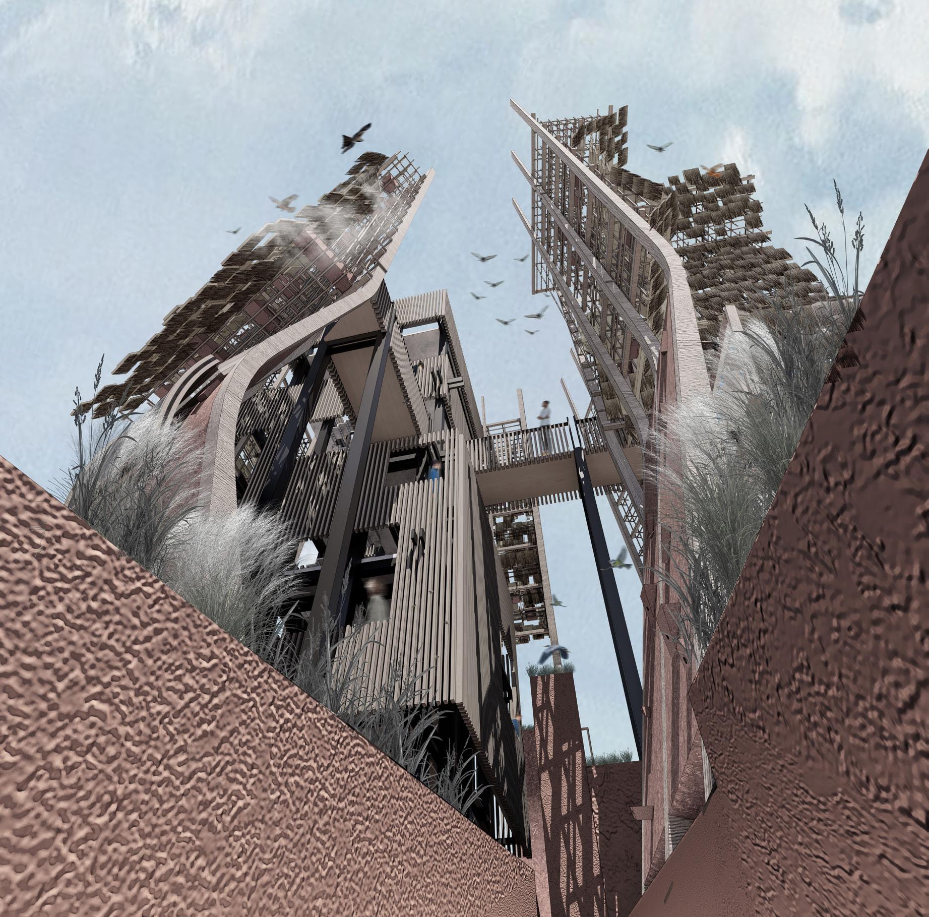 By 'peeling off' the co-exist residence, the structure's layered composition and internal organization are revealed, which explores into the component uncovers the innovative facade/mullion system as a dynamic interface with the natural surroundings. It incorporates features for passive environmental interactions: rainwater collection for irrigating vertical vegetation and meshed mullions serve as temporary perches for birds, offering shelter and rest spots for avian visitors.