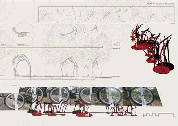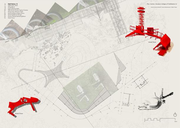 The physical articulation and technical drawings of ecological laboratory and bird observation tower reveal patterns, structural relationships, material assemblies and spatial arrangements that we situated across different scales, becoming a hybrid tectonic language.