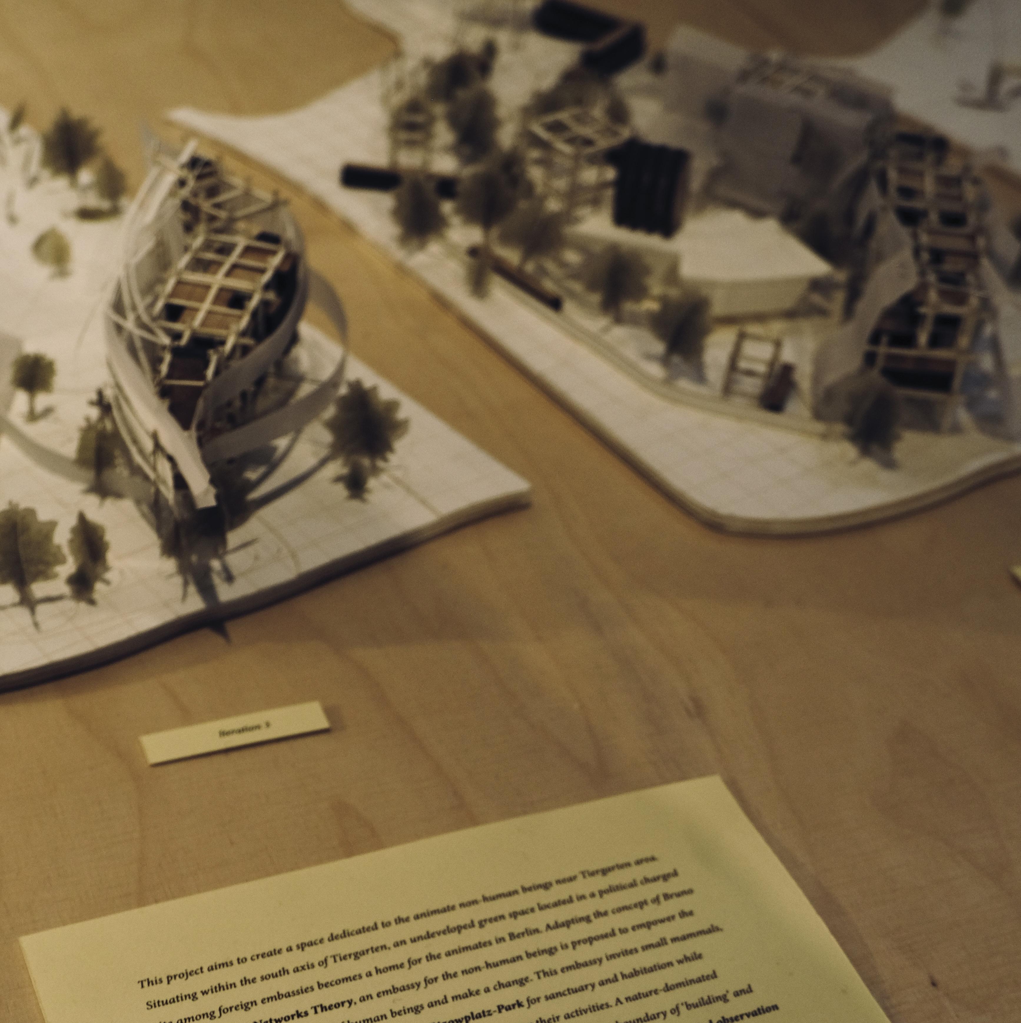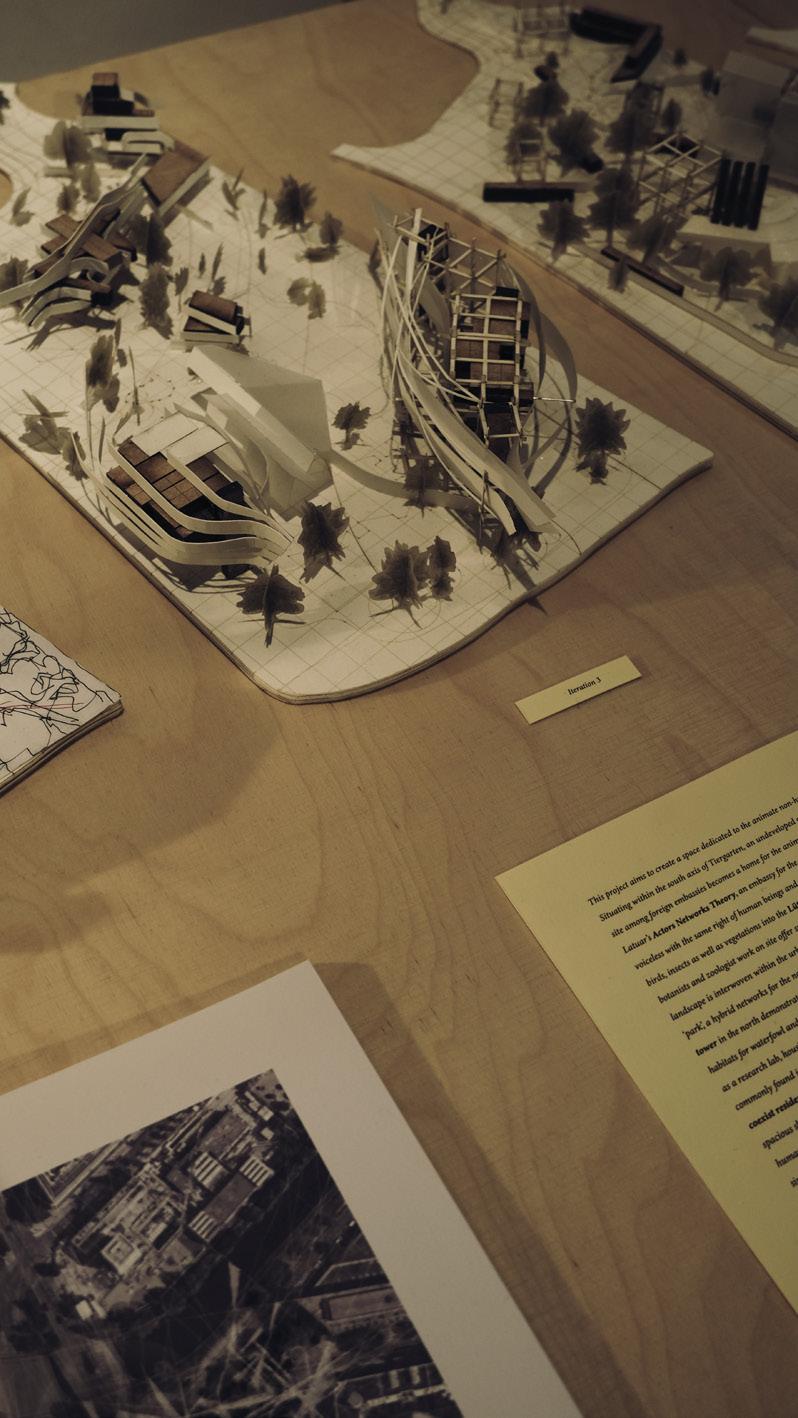 Building on our insights from field research, we expand our focus to the broader context of Tiergarten, we expanded our views to the larger area of Berlin. Based on the extensive research on the nonhuman animate sharing the living space with humans, we shift our focus from the once prosperous InterBau site to the NewBau area, reimagining a speculative future living in Lützowplatz-Park which nonhuman beings are granted sanctuary and agency within the urban fabric. The AIV 2024 Schinkel-Preis competition with its open theme helps to explore the question with more urban integration. Located in Lützowplatz-Park and surrounded by foreign embassies, an embassy for the nonhuman beings aims to create a space to empower the voiceless with the same right of human beings for sanctuary and habitation while botanists and zoologist work on site offer support and monitor their activities. Through iterative model-based design, we propose a nature-dominated landscape seamlessly integrated into the urban tapestry, blurring the boundaries between “building” and “park.”, a hybrid networks for both non-human animate and humans. By shifting the narrative away and embracing the agency of nonhuman actors, this project envisions a new paradigm of urban living rooted in ecological harmony between human and nonhuman beings. This vision extends beyond mere theoretical speculation; it offers a tangible blueprint for transformative action, one that challenges conventional notions of urban planning to imagine and co-create a more inclusive and sustainable future.