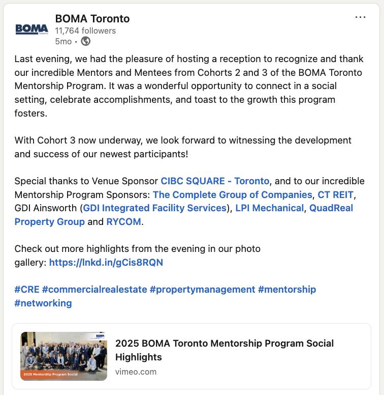 BOMA Toronto’s Mentorship program is designed to ensure our members from all backgrounds have access to personal development and networking opportunities. Mentorship is a rewarding way to create meaningful connections between industry peers, partners, and leaders.