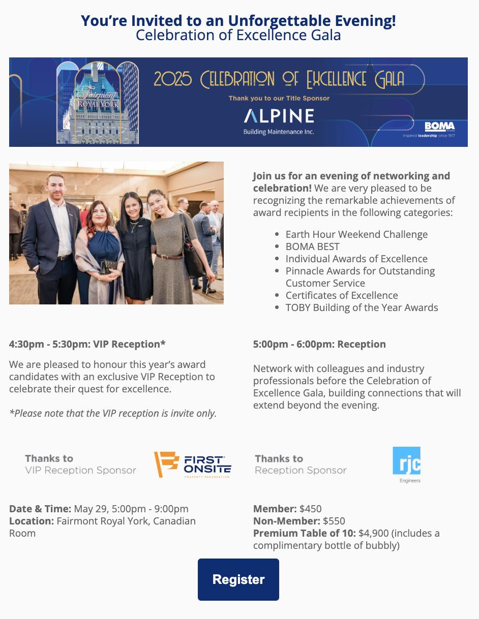 Our lead sponsors reach a curated audience on BOMA Toronto’s digital channels and targeted email marketing databases promoting both our popular Signature Events and sought-after education sessions.