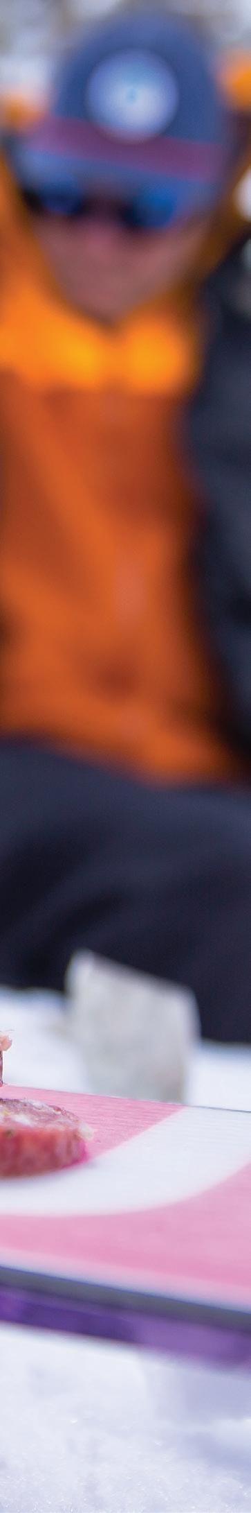 quickdraw carabiners or the sabertooth avy shovel at the bottom of your backpack. And remember, style points matter. Use the P-Tex base of your skis or snowboard as a makeshift cutting board upon which to fan out the elegant vittles (see #charcuteski on IG for inspiration). Bust out a red-checkered bandana as an impromptu tablecloth. The smallest details can make all the difference.