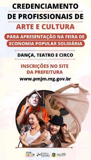 O edital, disponível no site oficial da Prefeitura, o www.pmjm.mg.gov.br, é aberto a propostas das áreas de música e intervenções cênicas (dança, teatro e circo) e prevê cachê único de R$ 700,00. Serão publicadas seis relações (lotes) de creden-