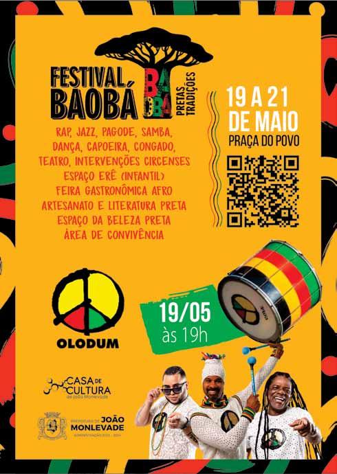 João Monlevade receberá a primeira edição do festival que promete agitar a cidade: o Festival Baobá – Pretas Tradições. O evento será promovido nos dias 18, 19, 20 e 21 de maio e terá como ponto culminante a apresentação da banda baiana Olodum, que sobe ao palco da Praça do Povo na sexta-feira (19), às 22h. Pág.