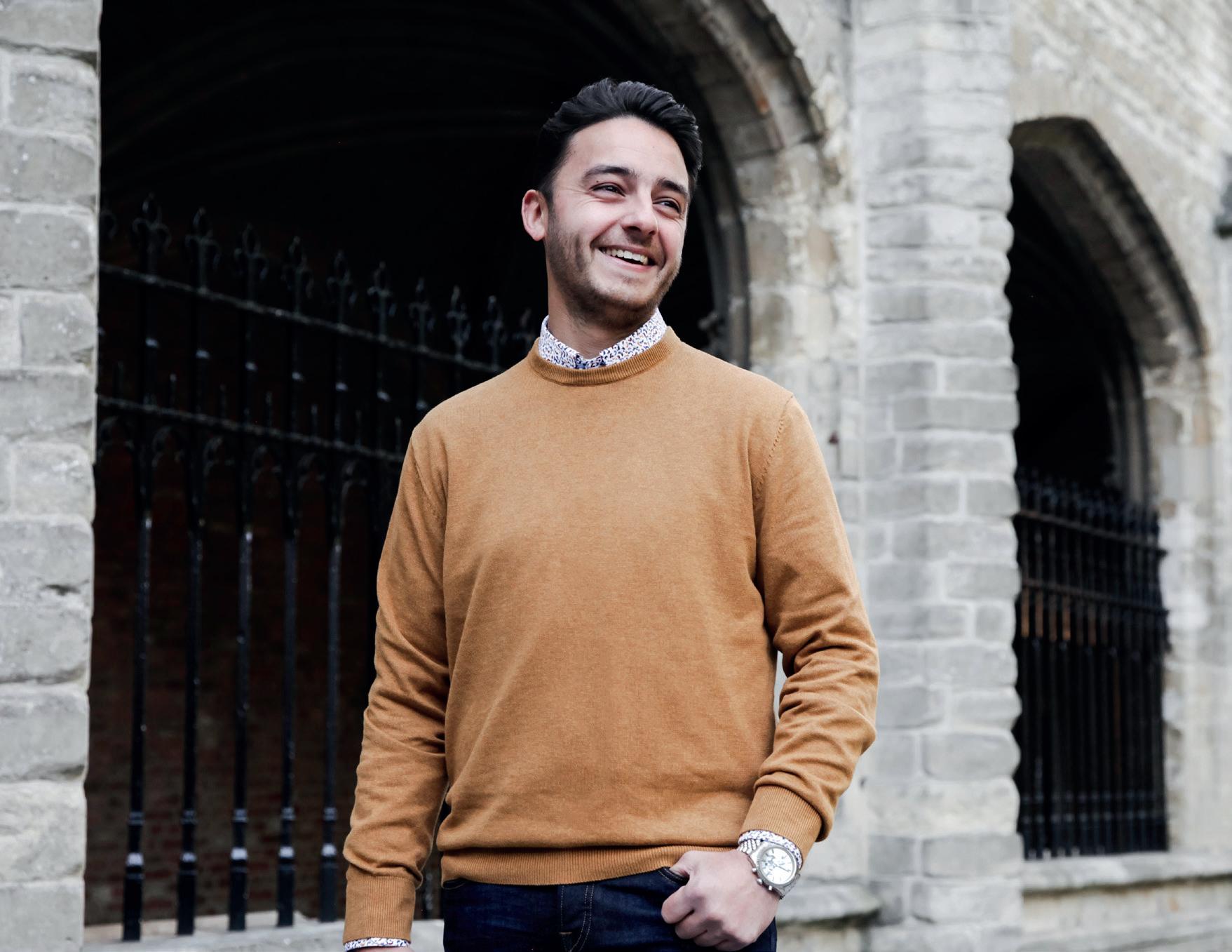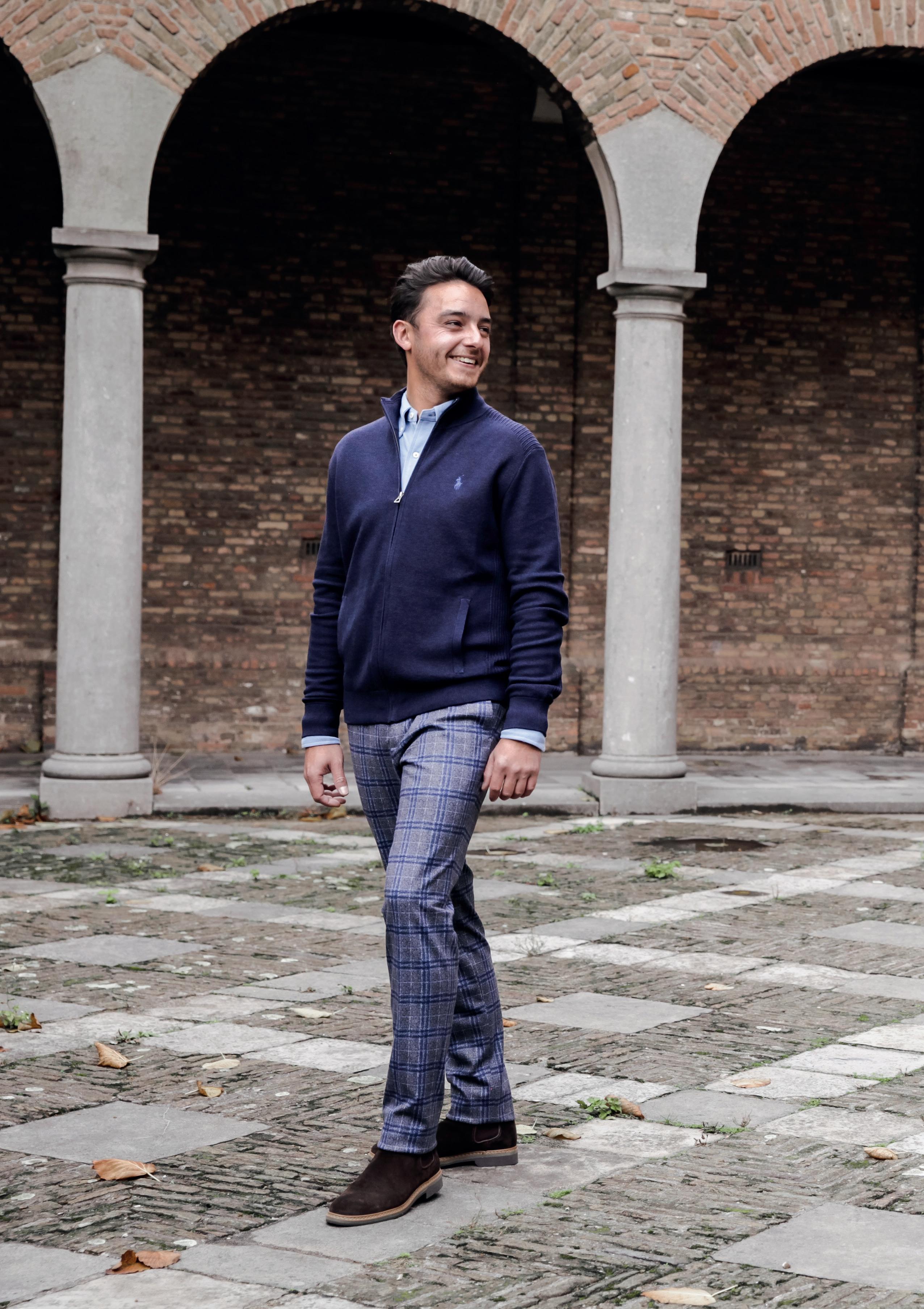 32 BLUE INDUSTRY , CHINO € 99,95 RALPH LAUREN , VEST € 199,OVERHEMD € 129,95 MC GREGOR , LAARS € 149,95