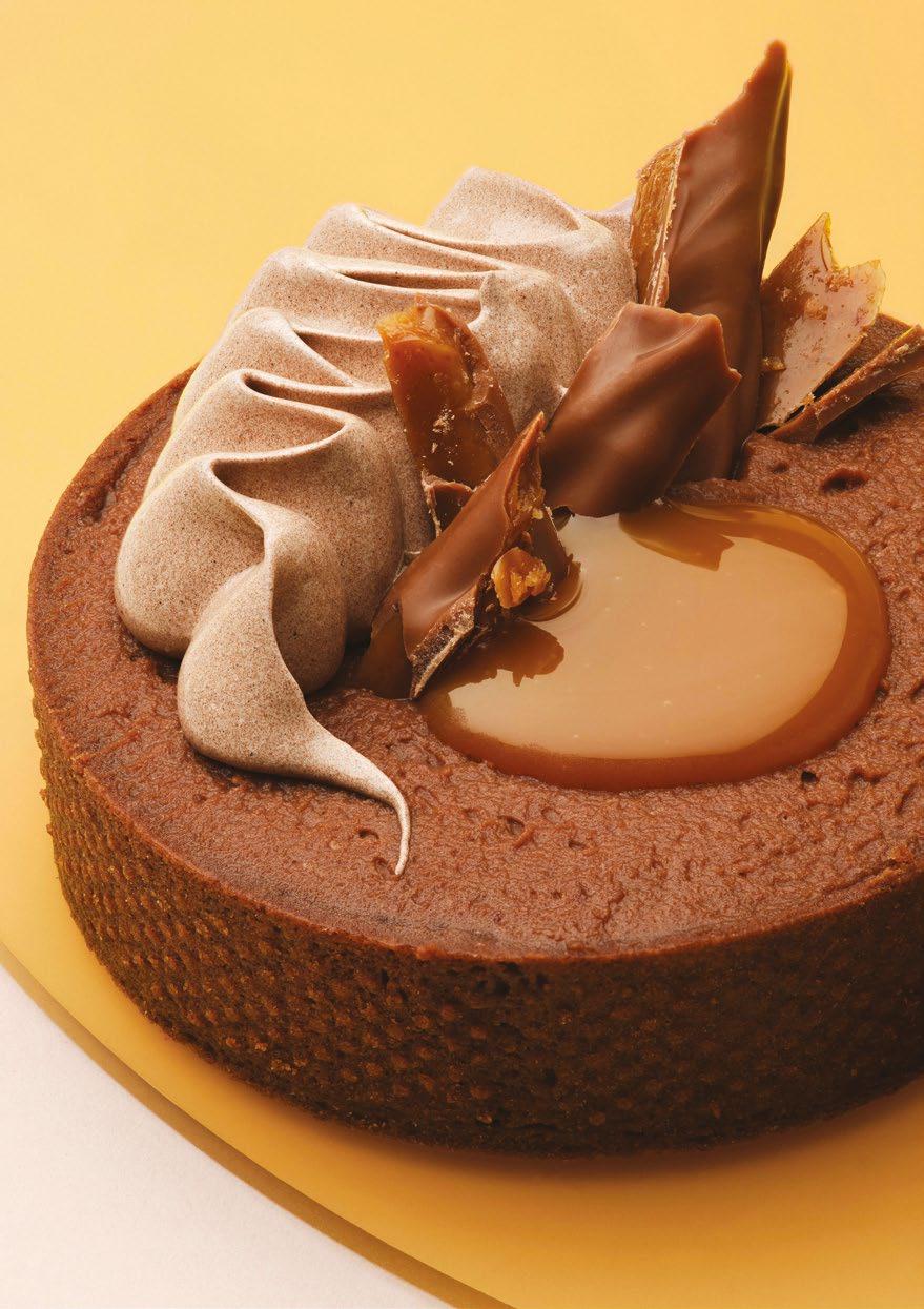 Pisk en glatt og blank marengs av eggehvite og sukker før du har i kakaoen. Ha marengsen på en sprøytepose og pynt toppen av kaken. Pynt med biter av daim og resten av karamellsausen.