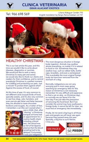 HEALTHY CHRISTMAS This is our last article this year, and this time we wouldn’t like to write about diseases, diagnostics or vaccines. We would just like to wish a merry Christmas to every pet and owner; we would also like to thank our clients and readers for their confidence, and to remind everybody Christmas is a perfect moment for cuddling and protecting our pets. Just a minute! To protect them against what? Against the excess of food, of course! At this time of year, it’s very common to eat different (and unusual) kinds of food, specially sweets, and it’s also very common to see how dogs, cats, hamsters, and even parrots get fatter and fatter because they are allowed to taste chocolate bonbons and nougats. As a matter of fact, I remember a cat (the cat I owned when I was a child), that, after “sharing” a Christmas banquet at home had an appointment for a routine health check including a blood test. Her blood was so full of fat (lipemic plasma) that the blood sampling had to be delayed. Fortunately, it was just indigestion.