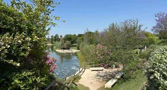 But don’t imagine a concrete reservoir. The park is landscaped beautifully with native and adapted plant species that not only tolerate waterlogging but thrive in it. There are birdwatching points, walking trails, and educational panels explaining the flora, fauna and hydraulic logic of the space.
