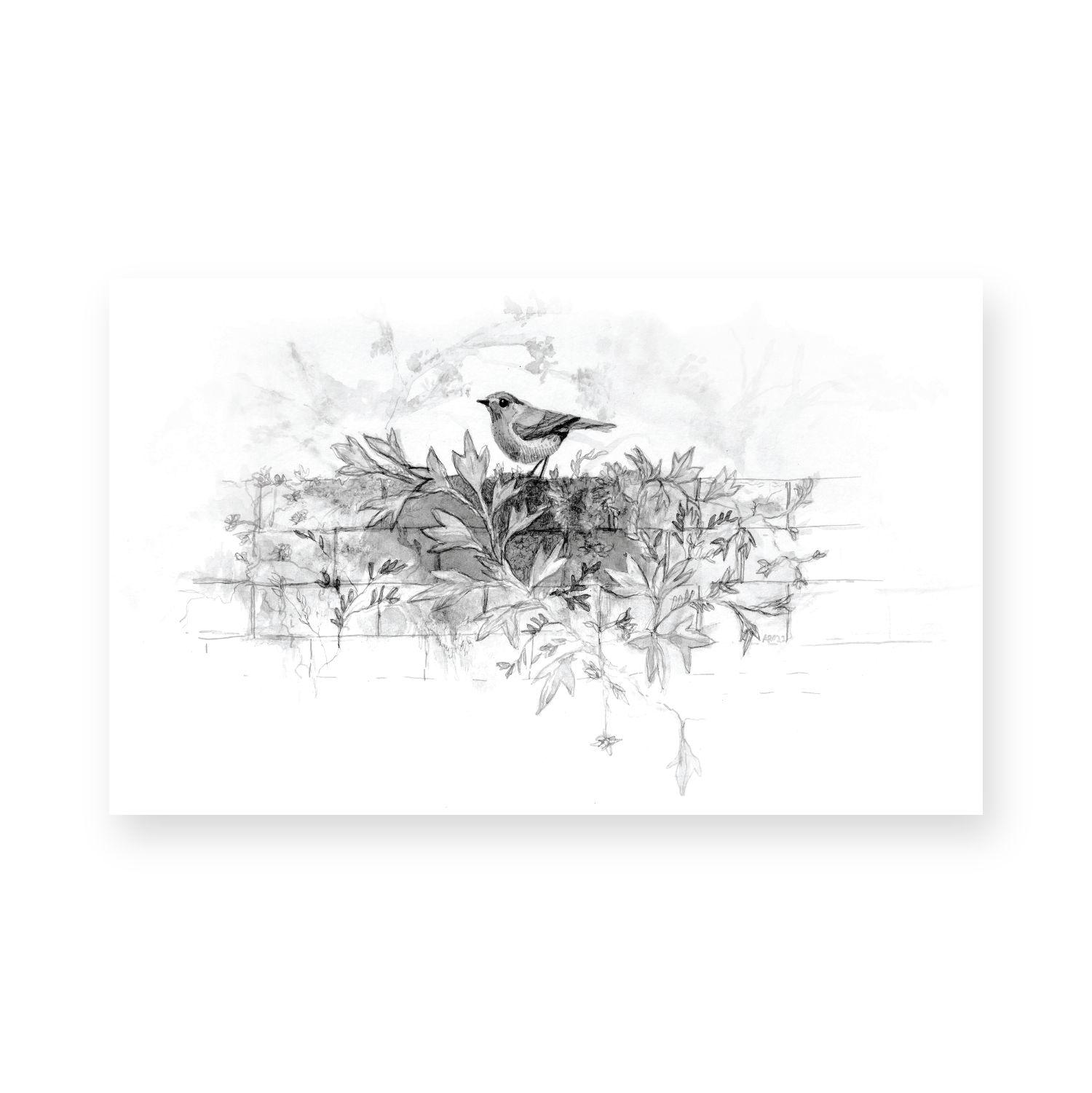 "Familiar illustrates the Robin sitting atop the garden wall, serving as its sentinel.Thetitleofthepiecebothevokes thefastfriendshipMaryformswiththe Robin,andtheconceptofa“familiar,” ananimalthathasamagicalbondwith ahuman,usuallyinreferencetowitches. The Robin in some ways serves as a familiar for Mary, guiding her to the garden and serving as her friend and ally."