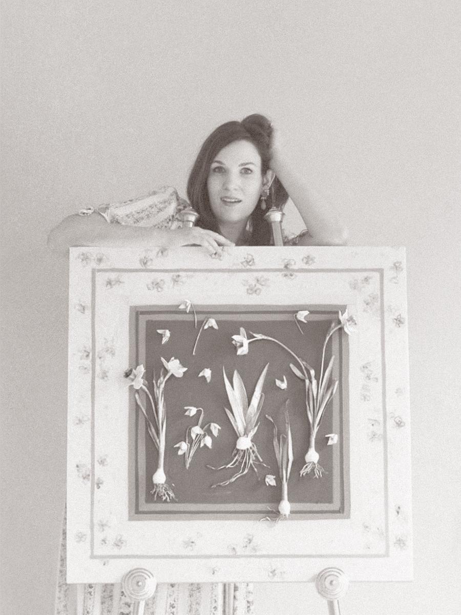 “The flowers are laid as if Mary carefully placed them. The deep mossy greensrepresentthemoistearth,theblue istheclearsky,andtheborderisclover thatappearsintheearlyspring.”