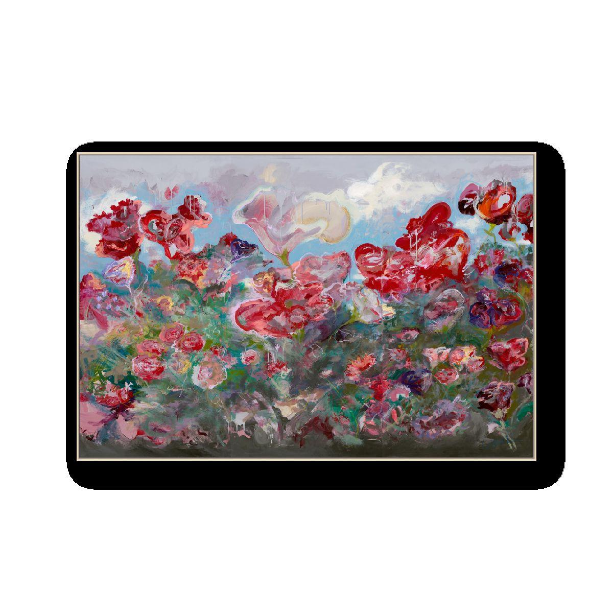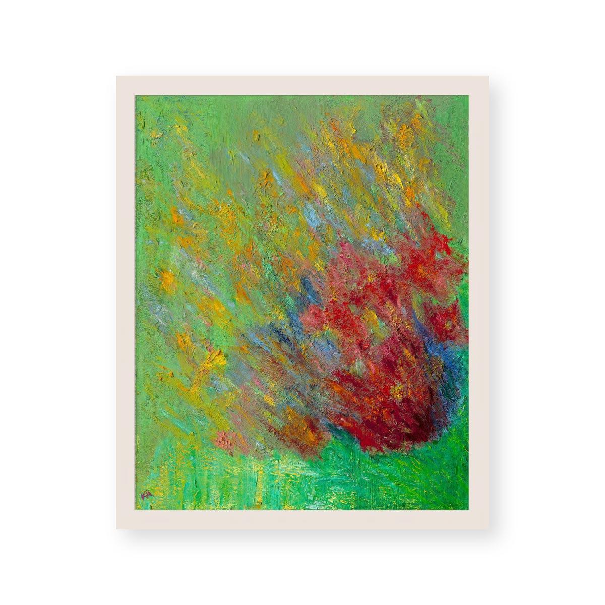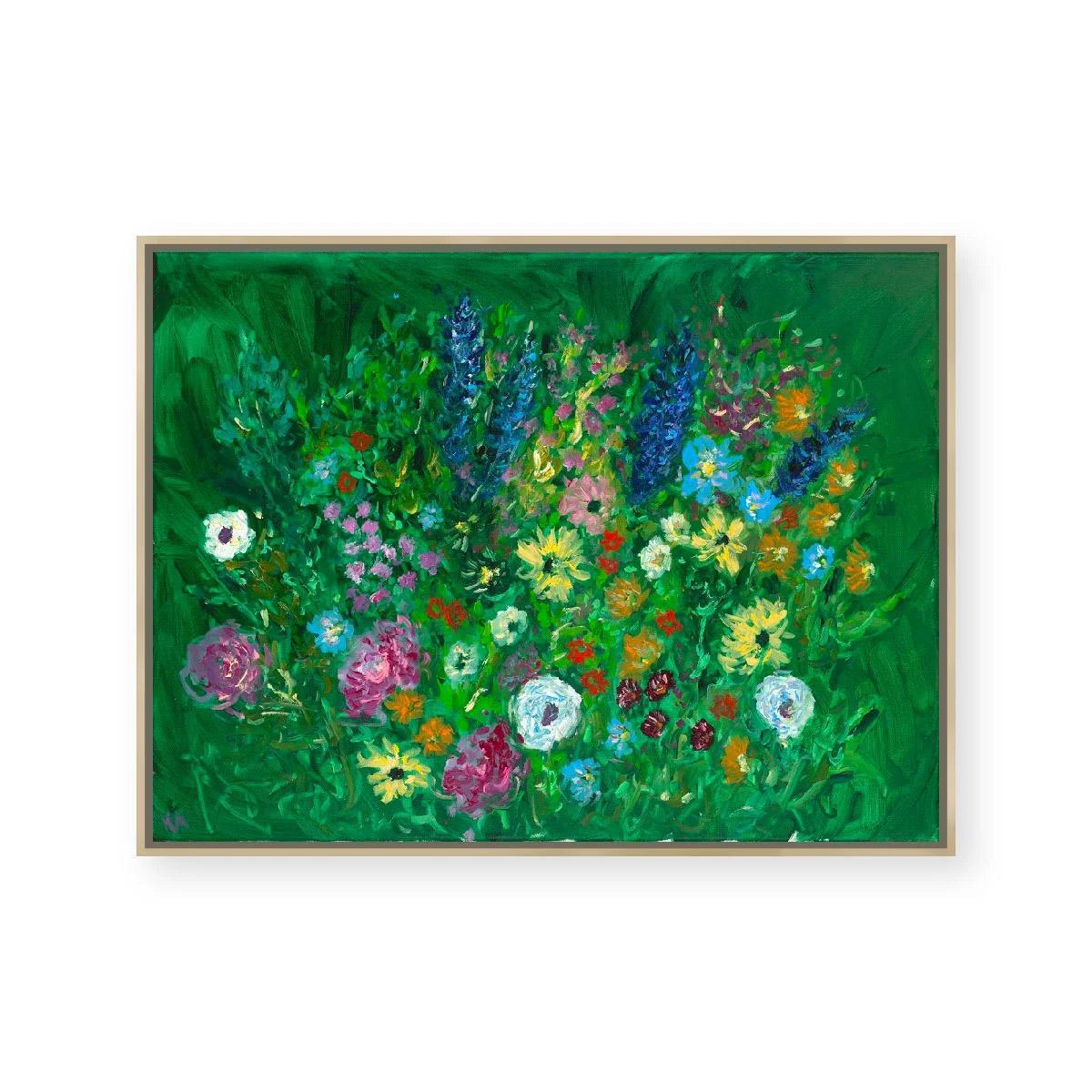Thedepthofmonochromecolorin DreamingofGreennowburstsforthinan arrayofdiversecolorandtexture.Thewide brushstrokesandlayeringofcolorsgivesthe flowersmotion,asiftheyareblowinginthe wind.SoManyFlowersremindsusofwhat cangrowwhenwepracticepatience,andnot toforsakethegardenforitsblooms.