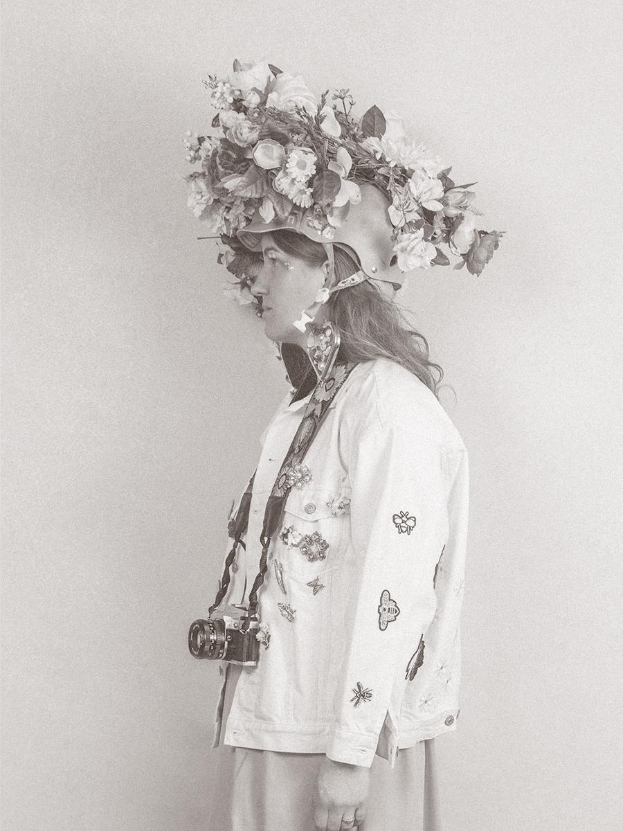 NeverAlonefeaturespinkbeadeddetailsto suggestagildedcage.Thebackgroundis vibrantandcolorful,yetthegirlis photographedinblackandwhite,signifying herdetachmentfromhersurroundings.By titlingthework“NeverAlone”,Julia emphasizesthatdespiteMary’sisolationand abandonment,shestillisabletoconnectwith thesnake.