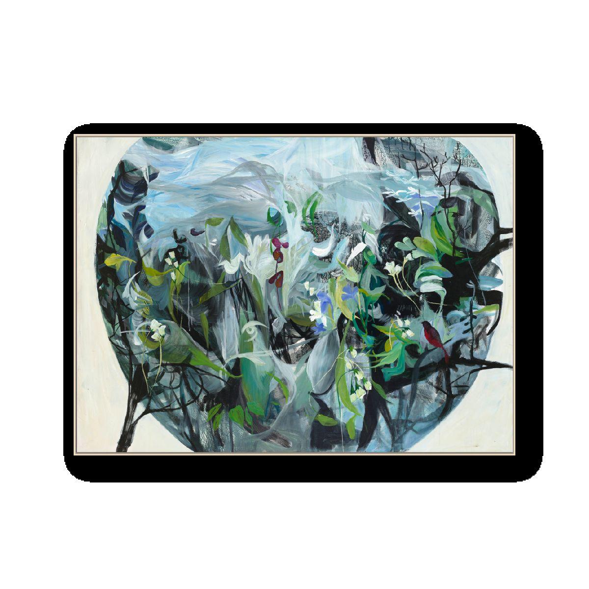 Awakeningisaptlynamed,alivewithcolor andmovement.Likethelifespanofatree, Julia’senvironmentiscyclical,givingwayto newgrowth.Thecircularframingreplicates youreyethroughakeyhole—likealittle kaleidoscope.Asitturns,theseasonschange, yourmoodshifts,andthingsstarttolook different.Theblackbranchesvisiblebeneath thegreenandbluenotonlyrepresentthepast stateofthegarden,butthefertileground neededtoproducelife.