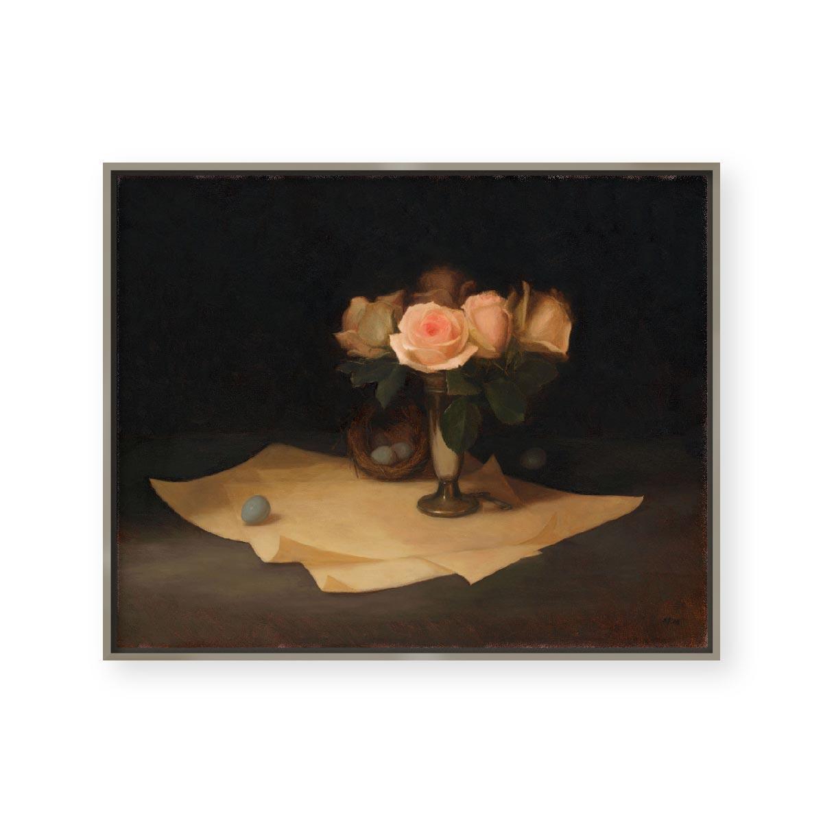 Theposed,meticulousqualityofAbigail’s VanitasStillLifereflectsthefragilityoflife. Byremovingtheorganicelementsofthe garden—suchasColin’smother’srosesand therobin’seggsfromtheirnaturalcontext, Mathesonremindsusofthetemporary, fleetingnatureofsuchobjects.Preservedin timelessoil-paintperfection,we’reabletofeel reliefknowingonthecanvas,theywillremain astheyoncewere.