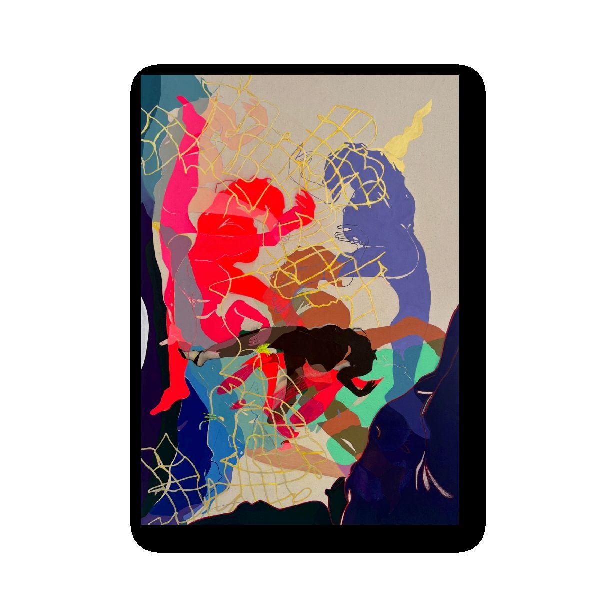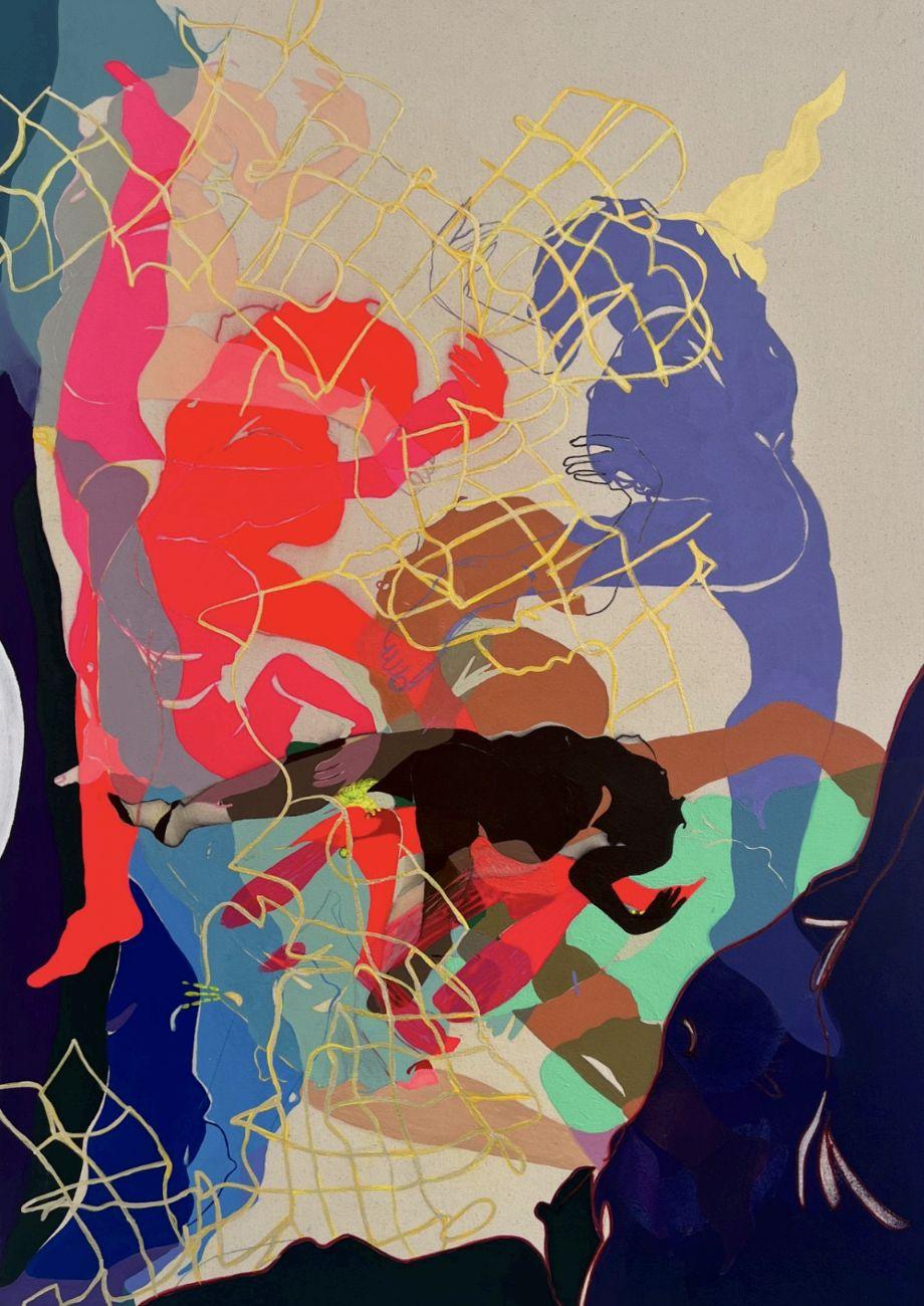 “Thisimageevokesmemoriesandraises questions about the death of my childhoodbestfriendandfirstlove.The overlapping, descending, floating, and dissipating body within the paintings symbolizes the haunting questions that echowithinme.”