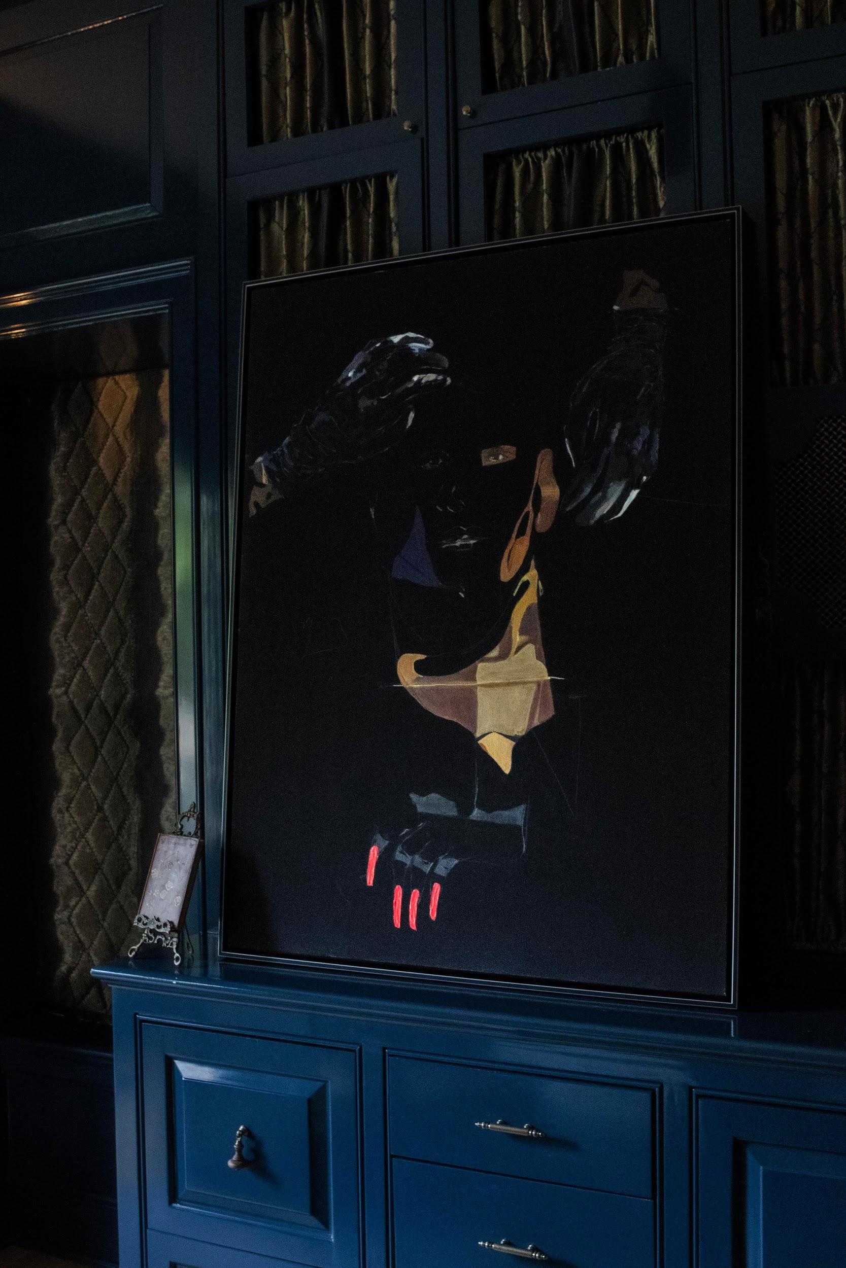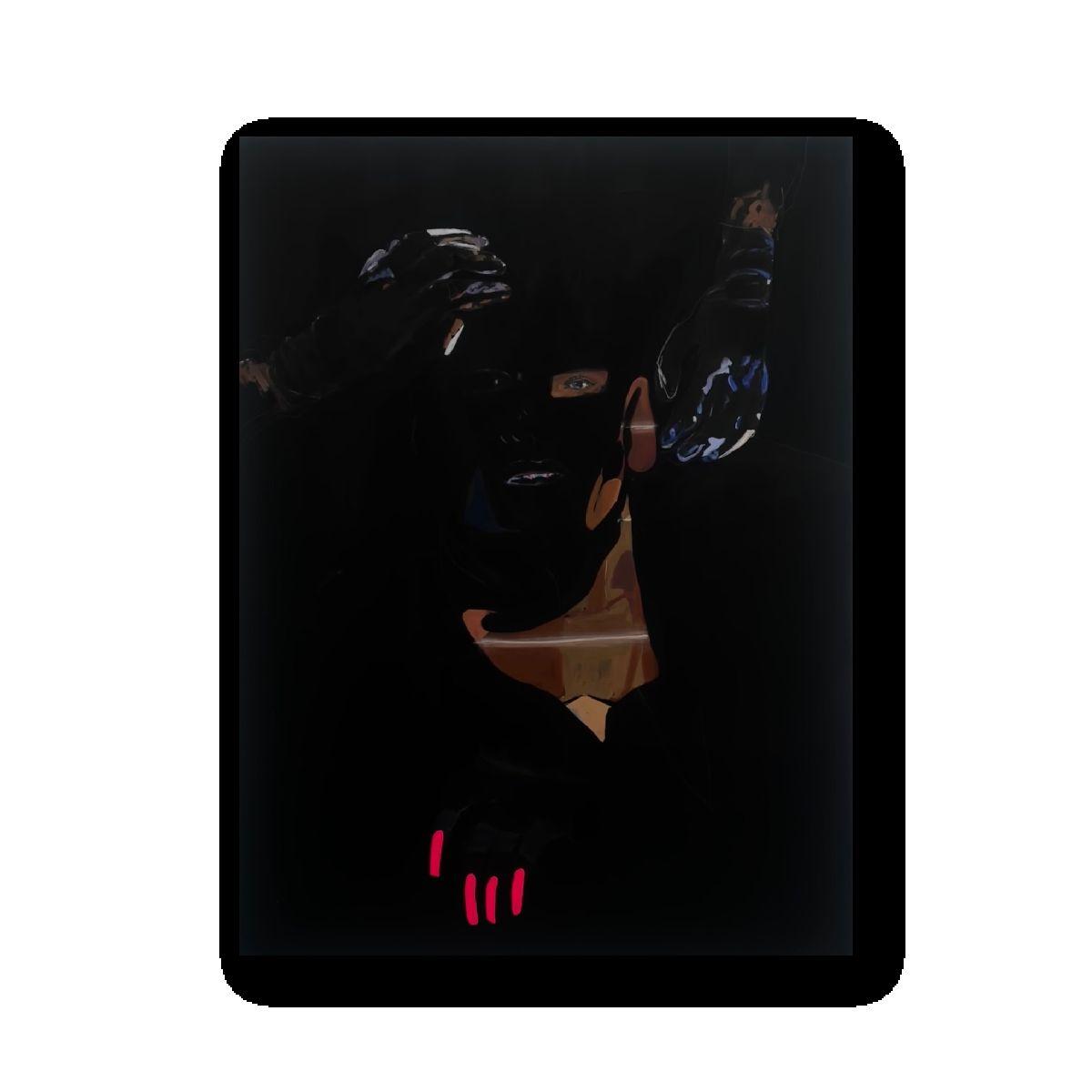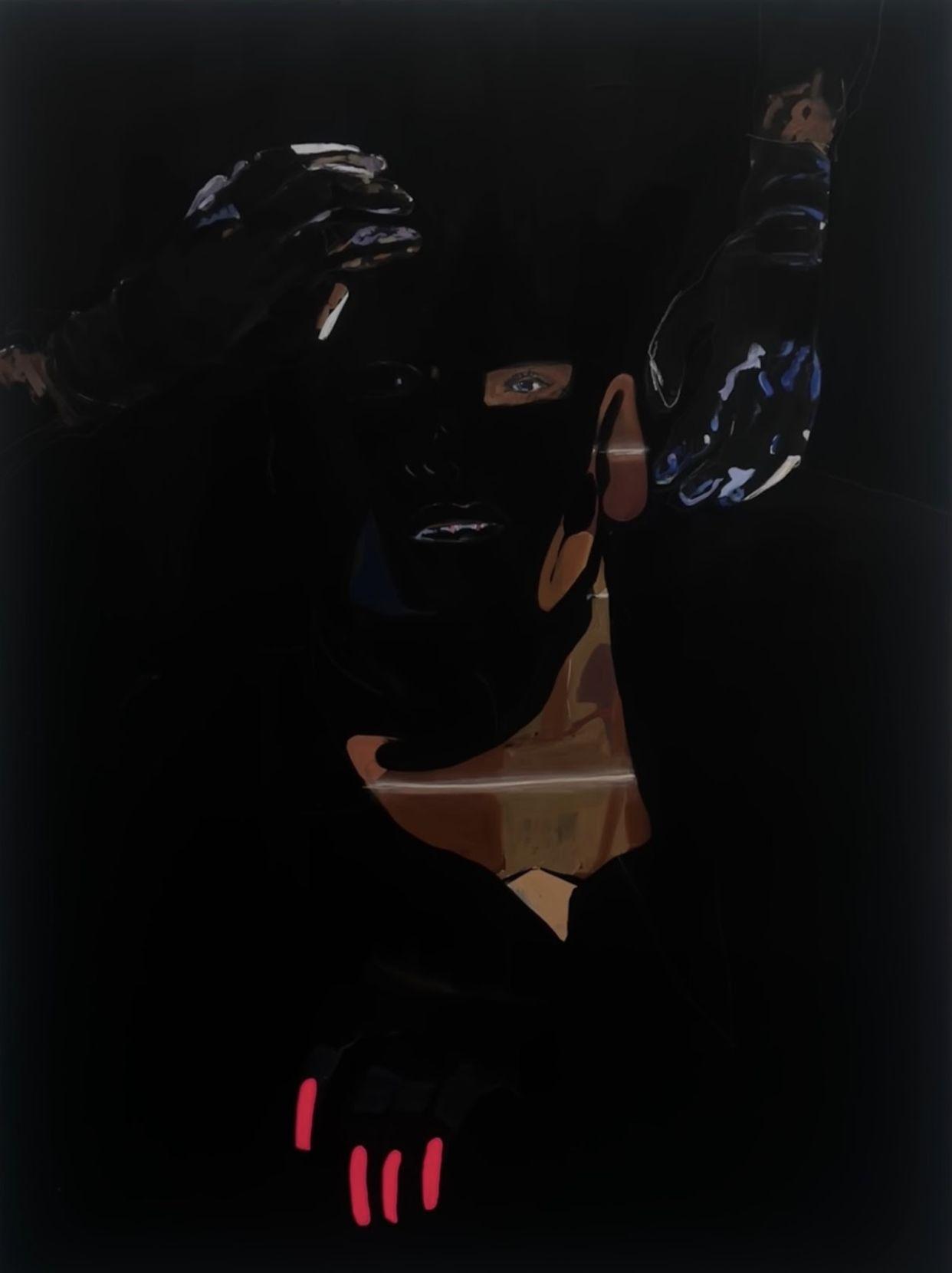 PortraitofTheBeautifullyDead(Night) referencesitsDaycounterpart,yetwithmuch ofitscompositionconcealedbydarkness. Symbolizingnight,theviewerisobservedbya piercingeyeandtheominoussilhouetteof hands.Thematteultra-blackpaintreflects verylittlelight,givingittheappearanceof absentspaceratherthansimpledarkness.The neonpinkfingernailscreateashocking contrast,andwouldbecompletely unidentifiablewithouttheotherdiptych, remindingviewershowasingletruthcantake ondifferentmeaningdependingonthe context.