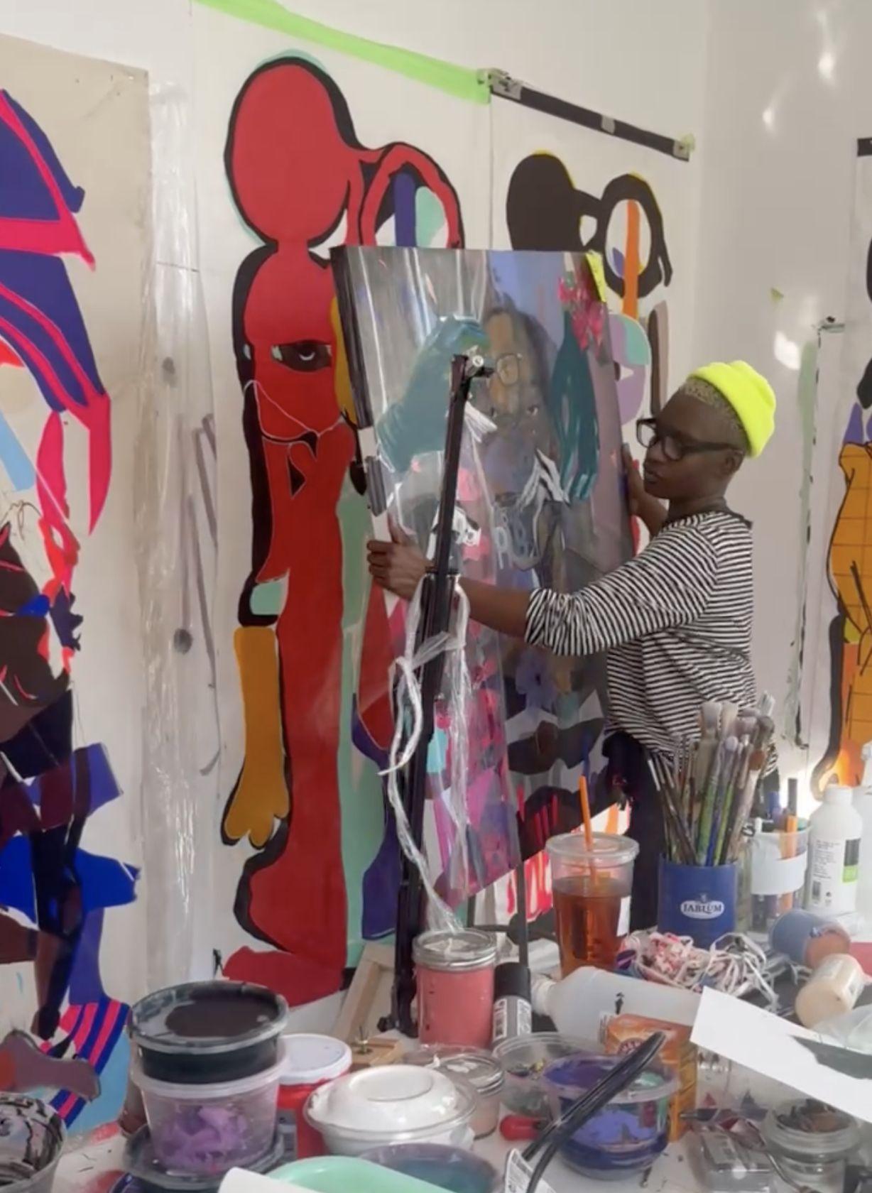 PortraitoftheBeautifullyDead(Day) amalgamatesthefeaturesoffamous individualswhopassedawayin2022.In contrasttoitsNightcounterpart,thiswork posesacommentaryonthethinlinebetween beautyandmonstrosity.LiketheCreature, whoVictorintendedtobebeautifulbut insteadhasaterrifyingappearance,Mekia’s workispowerfullyunsettling.Composedof spraypaint,chalk,andevensplintersMekia sustainedduringaninjuryinthestudio,this staggeringpiecehasphysicalpainliterallybuilt intothepaint.
