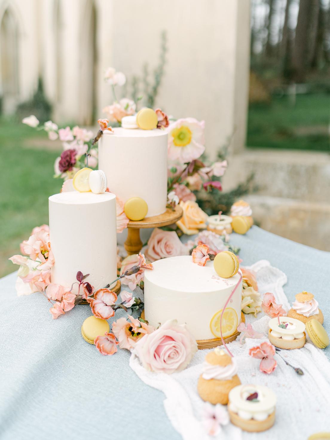 “When it comes to which covering to choose for your wedding cake it all depends on personal taste, some people love the taste of fondant, whereas others prefer a lightly whipped buttercream exterior. I use Italian meringue buttercream to cover my cakes, and this has such a wonderfully light, not overly sweet, softly whipped texture. You can flavour it to complement the fillings or colour it with fresh fruit puree like raspberries for a subtle colour. Fondant coverings work brilliantly with sugar and wafer paper flowers, whilst buttercream and ganache-covered cakes are beautiful when paired with fresh florals and foliage. With buttercream and ganache, you can also be bolder and more adventurous with your filling choices as these styles can be kept in the fridge, keeping perishable fillings such as fruit curds and cream cheese frostings safe.”