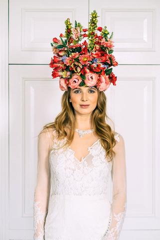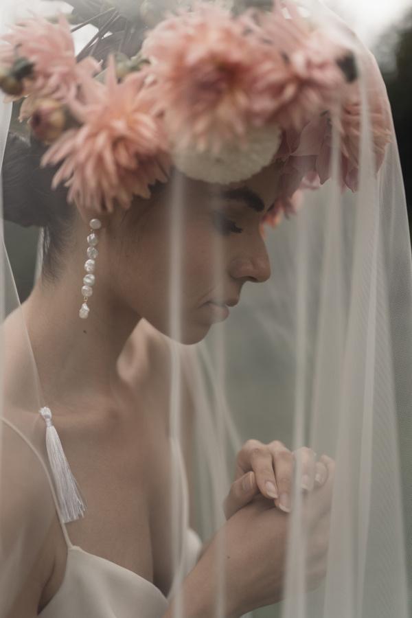 “The summer story fashion consisted of a striking pink gown and cathedral-length veil by Felisiti Greis The dramatic gown has a dropped waist corset and layers of semi-transparent tulle with hand appliqué flowers Our model had an important role. She helped create movement and a ‘sense’ of a wider story. We see a wisp of a veil and a swish of a skirt."