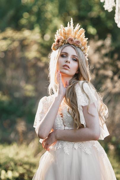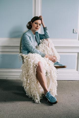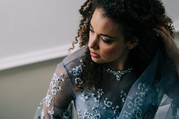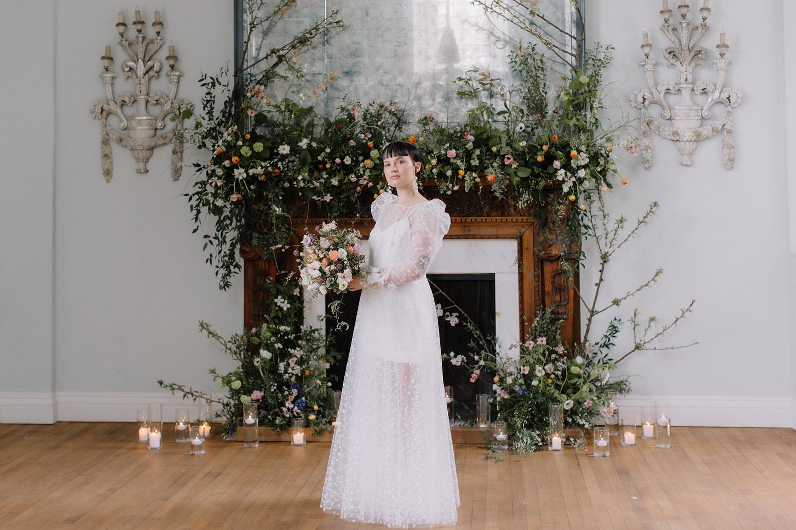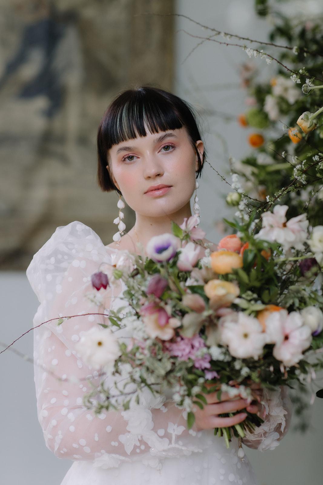 "When choosing the looks for the shoot, Joanna wanted to stick to British bridal couturiers who would create romantic gowns with bold silhouettes and flower details. For the spring story, she chose a flower texture slip dress with puffed sleeves by Alyce Jayne Bridal paired with Diane Hassall Shoes and handmade porcelain flower jewellery by PS With Love A second aspring look was chosen by Felisiti Greis and included a corseted dress in feather-light tulle with dreamy sleeves. This look was completed by Diane Hassall Shoes and a W Collective ribbon tried around the neck in a bow.”