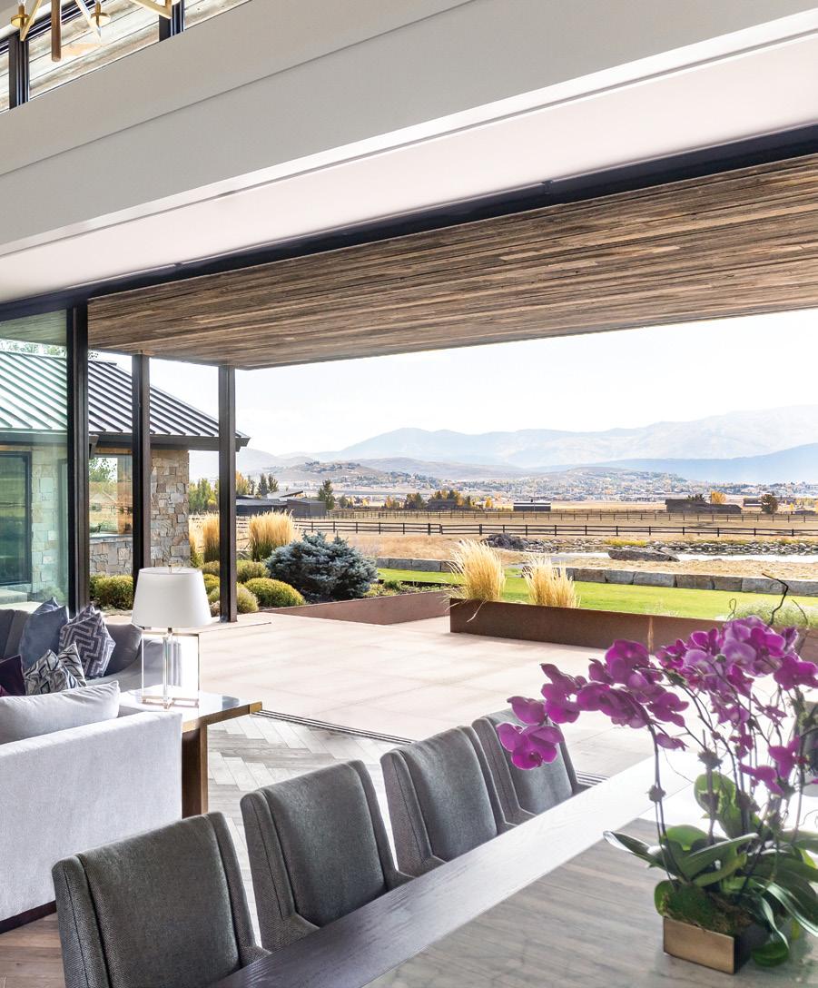 ABOVE: The home sits on 50 acres of Park City ranch land. During its renovation, the exterior didn’t require much of an overhaul. Updates to window framings and key doors begin the subtle bridge between two distinct worlds—mountain ranch on the outside, Fifth Avenue on the inside.