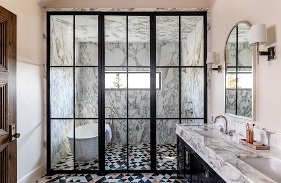 LOWER LEFT: In the primary shower, powdercoated steel framing and sleek Waterworks hardware offer contrast to the striking Calacatta Turquoise marble.