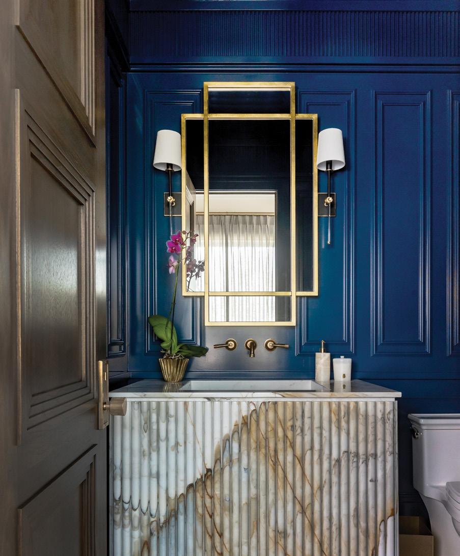 TOP: Calacatta Turquoise marble sheathes every available surface of the primary bath in cool tones. Other elements of the room play a supporting role: vanity sconces by Visual Comfort, cabinets in a soft white by Benjamin Moore and metal elements are all grounded by the bold stone.