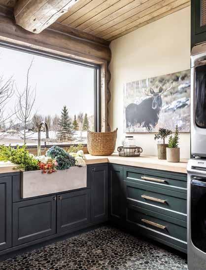 ABOVE LEFT: Inspired by the natural landscape, the laundry room décor features a wood-paneled ceiling, pebble-stone tile floor and cabinets painted with Sherwin-Williams' Rookwood Shutter Green. Cabinet pulls are from Rocky Mountain Hardware.