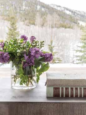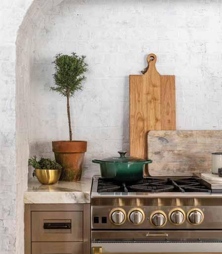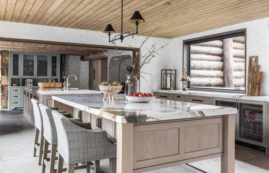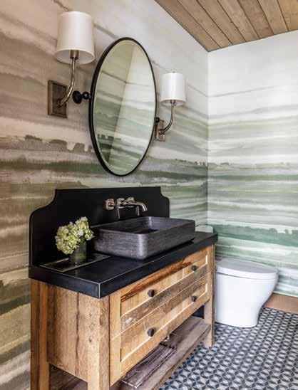 Light hues brighten the kitchen, where a lower ceiling dictated by the existing structure is clad in flaxen cedar planks. Lime-washed brick hides irregularity in the original walls, and large double islands showcase the soft graining of white oak. “Our client opted for large windows instead of upper cabinets, so we maximized storage using the two islands and lower cabinets,” Chipman explains. A pistachio-hued hutch showcases the decor’s natureinspired color palette, as do the laundry room’s shutter-green cabinets and the powder room’s sage-toned Phillip Jeffries’ wall mural. “We used a lot of greens and earth tones to connect to the outdoors,” she explains.