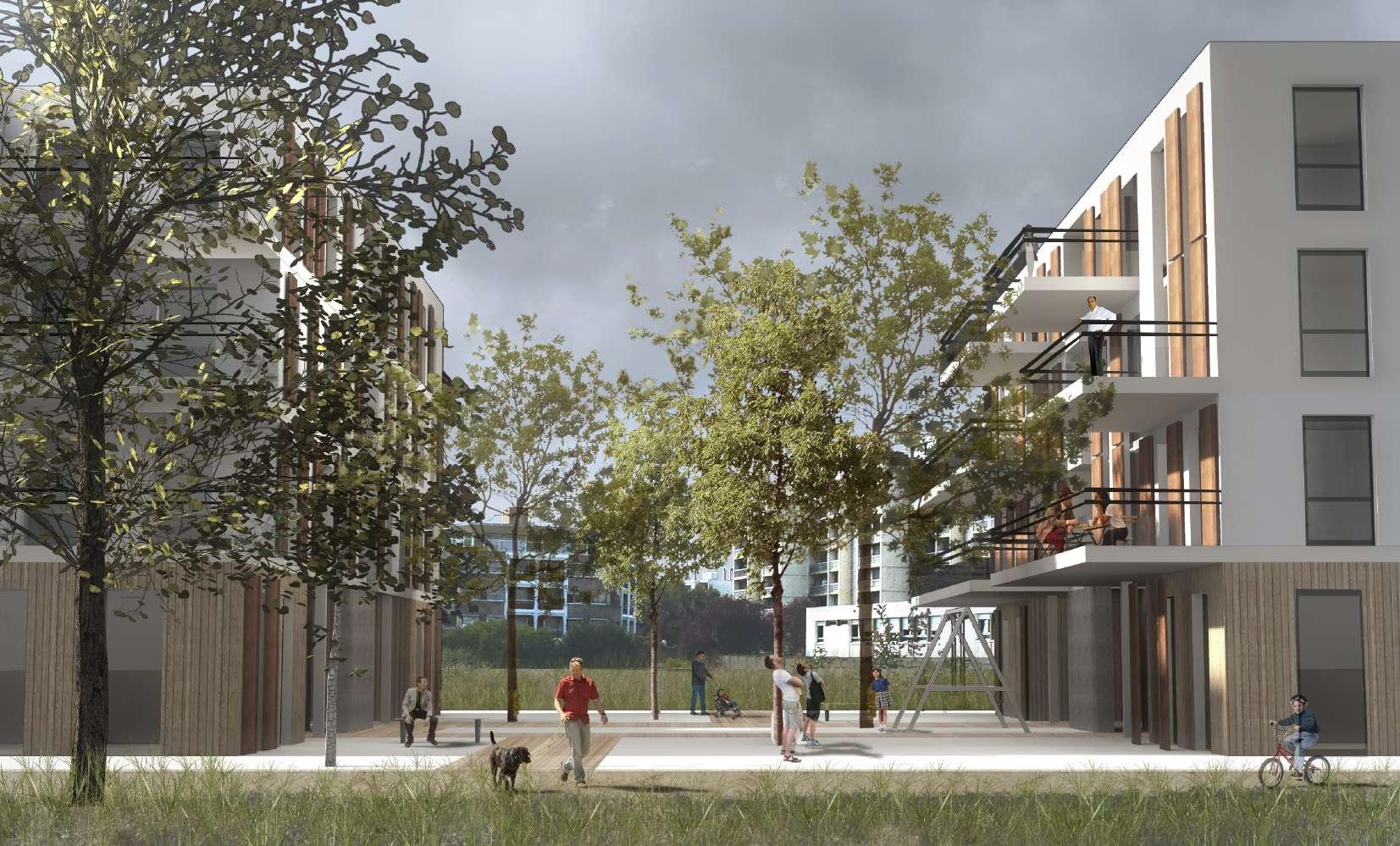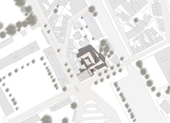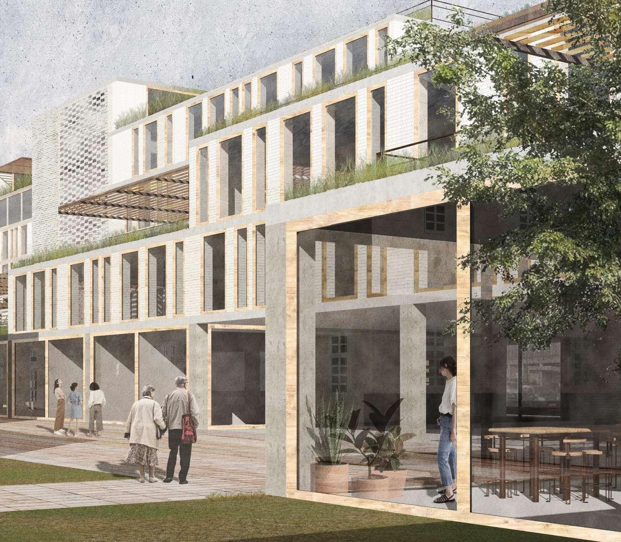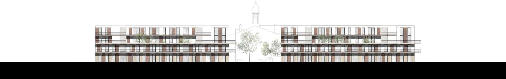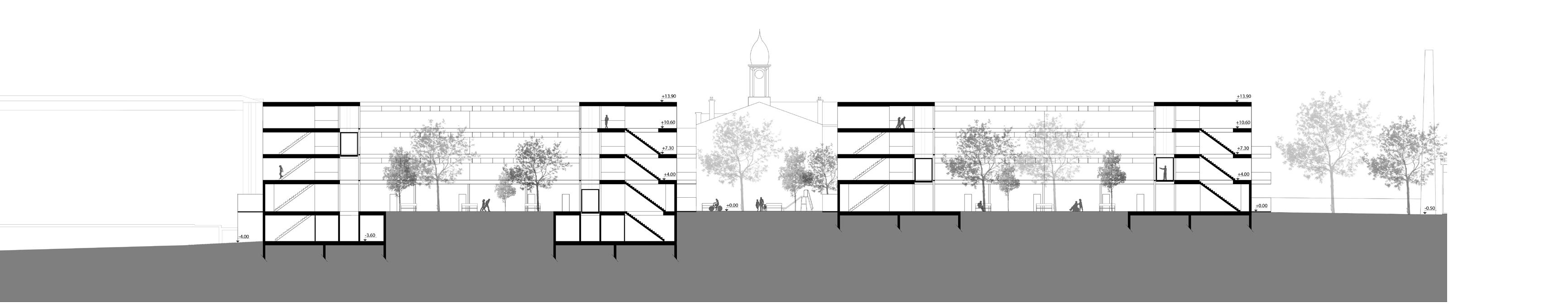 Les deux bâtiments principaux permettent un cadrage sur l’édifice inscrit du lieu par la création d’un espace public végétalisé. Cette zone crée un lieu de rencontre entre les deux corps de bâtiment dans le but d’établir une proximité entre les habitants.