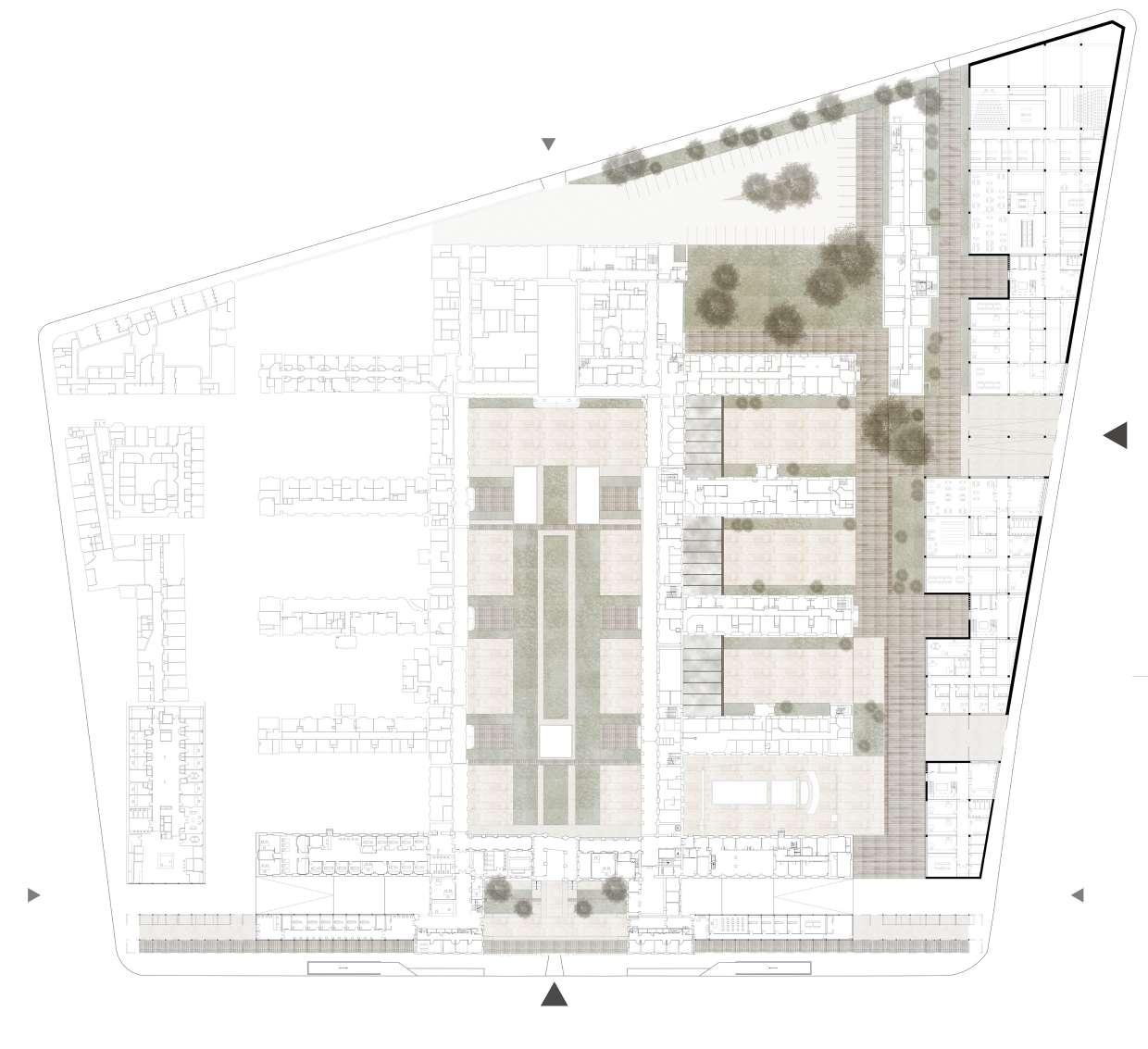 Les pleins et les vides de cet ensemble hospitalier s’appuient sur la trame existante des pavillons originaux.