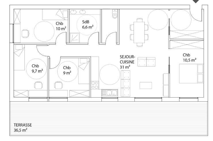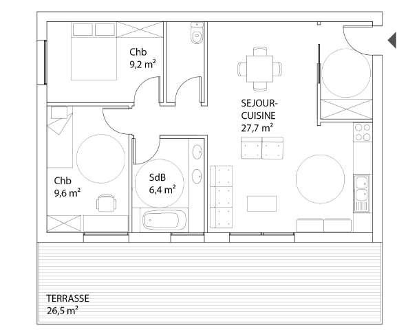 La composition architecurale permet à chaque cellule d’habitation de jouir d’une lumière agréable, et d’une vue sur le parc du site, avec la présence permanente d’une terrasse extérieure.
