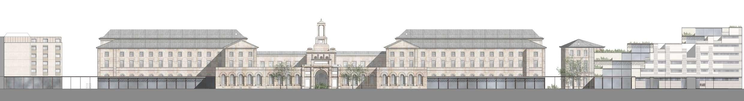 La création d’une salle de représentation officielle modifie le rapport à la rue du bâti notamment grâce à l’apparition de ce trait urbain. Cette architecture lie le projet à son contexte, par la liaison des hauteurs du bâtiment des Archives et de la Caserne voisine.