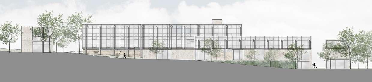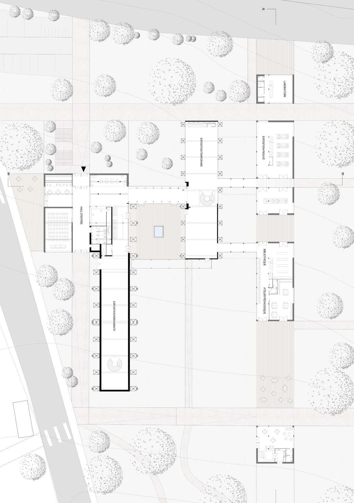 La zone d’accueil, la librairie et la cafétéria marque la nouvelle entrée du bâtiment tout en créant une façade sur rue attrayante. Les laboratoires, les archives et les bureaux sont positionnés dans l’édifice Est. Ce dernier engage la connexion entre le parc de Montaigu et le Musée, à travers la conception de percées et de passerelles extérieures qui donnent à voir l’environnement végétal du site.