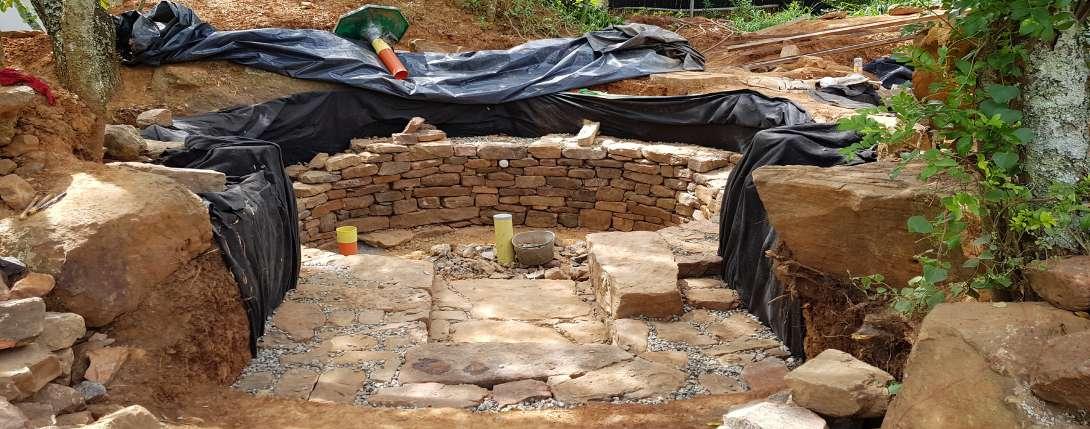 Encadré par un couple d’architecte et d’archéologue hollandais et d’un couple colombien, l’objectif était de réaliser deux salles de bain, en plein air, en utilisant les ressources disponibles sur le site, et en réduisant au maximum l’usage de ciment et de béton. Ces dernières sont réalisées en pierres sèches et enclavées dans la topographie du site, ce qui permet leur insertion dans leur environnement naturel verdoyant.