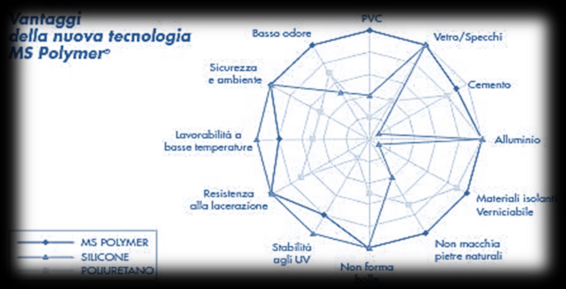 Queste le principali caratteristiche di MS POLIMER: - Ottima adesione su una ampia varietà di superfici. MS POLIMER può essere applicato con semplici pretrattamenti su differenti substrati (alluminio, alluminio anodizzato, GRP poliestere e acciaio inox): ottima adesione senza primer su molti metalli non verniciati e su legni duri quali mogano e tek (talvolta può essere consigliabile una semplice pulizia a tampone, ottima adesione anche su vecchio silicone o poliuretano (si consigliano in ogni caso prove preliminari);