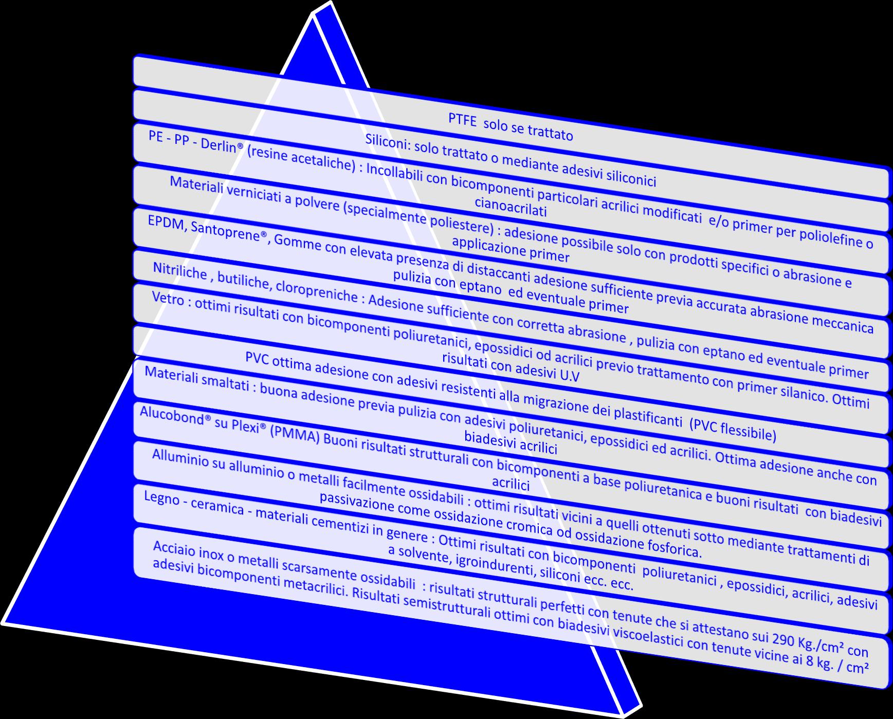 Il mondo delle tecnologie adesive è costretto a misurarsi con una gamma di materiali tendenti all’infinito. L’evoluzione tecnologica e le crescenti variabili coinvolte nei processi produttivi (additivi, stabilizzanti, pigmenti, cariche, distaccanti) sono una piccola parte delle variabili che condizionano la buona riuscita di un processo d’incollaggio. A questo proposito può essere di grande aiuto nella fase preliminare, testare le superfici con una semplice gocciolina d’acqua. Tale esperienza consentirà di verificare in maniera semplice e veloce se esistono possibilità reali di ottenere una buona tenuta del sistema. Esistono comunque buone possibilità anche su materiali definiti critici o LSE (low surface energy) grazie a linee di prodotti dedicati e a preparatori superficiali.